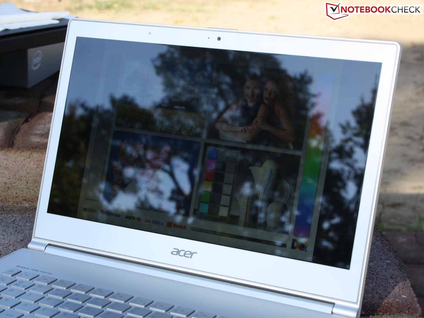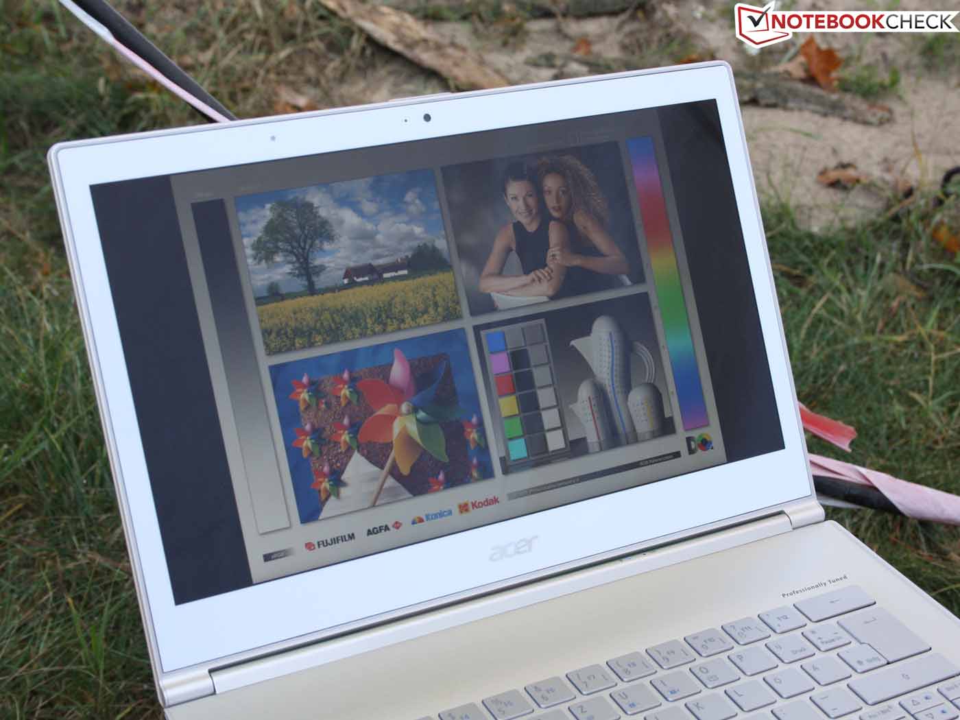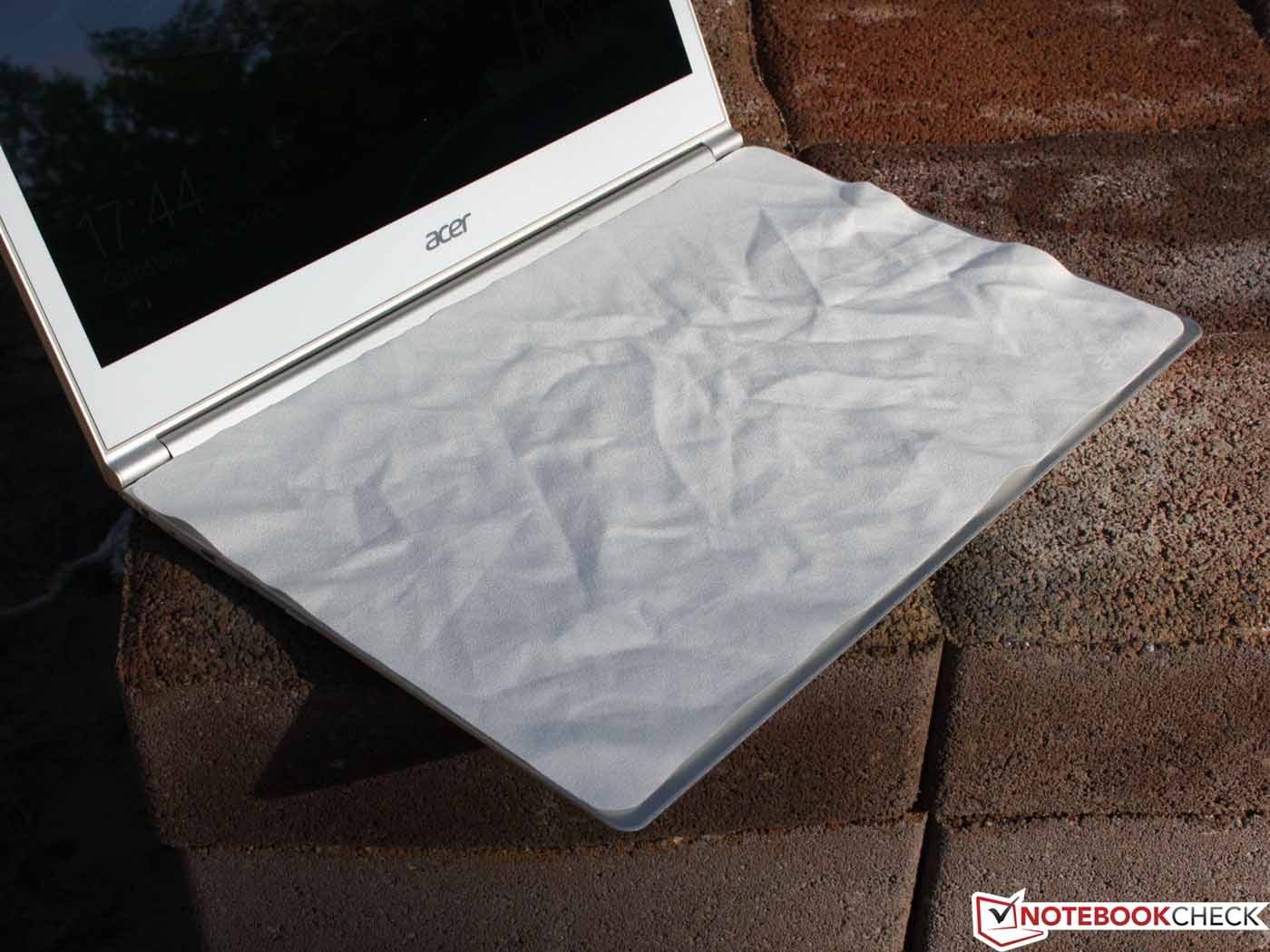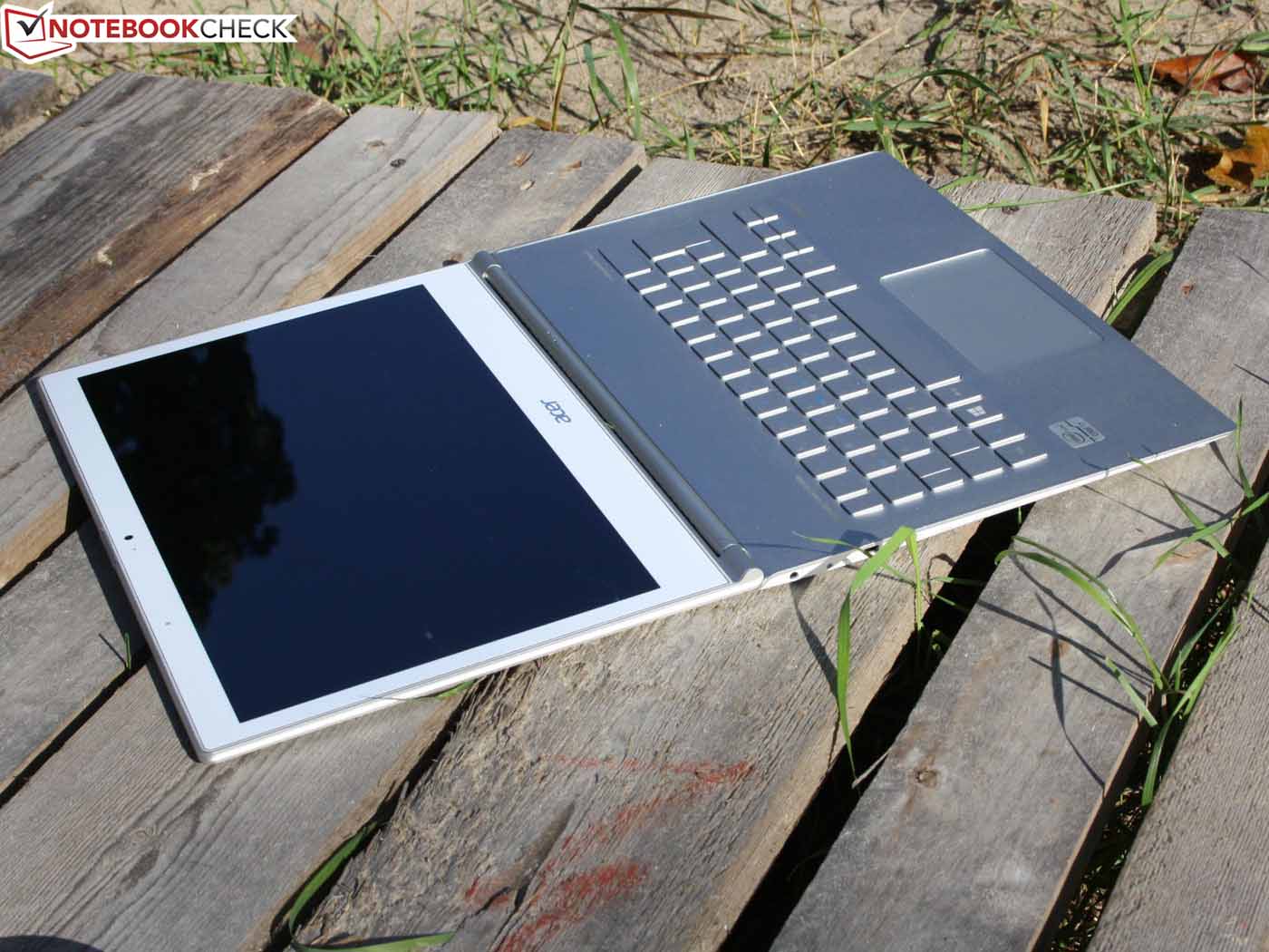 Der Helligkeitssensor am oberen TFT-Rahmen irritiert unsere Messung nicht, denn auch bei greller Lichteinwirkung bleibt das Ergebnis dasselbe. Am Netz können wir gut beobachten, wie der Sensor für eine adaptive Steuerung der Panel-Ausleuchtung sowie der Tasten-Beleuchtung sorgt. Im Bezug auf die Outdoor-Tauglichkeit der Anzeige sind Samsung und Asus dem Acer S7 haushoch überlegen (entspiegelt, hohe Helligkeit). Das MacBook spiegelt, ist aber deutlich heller (im Akkubetrieb, sonst nicht).