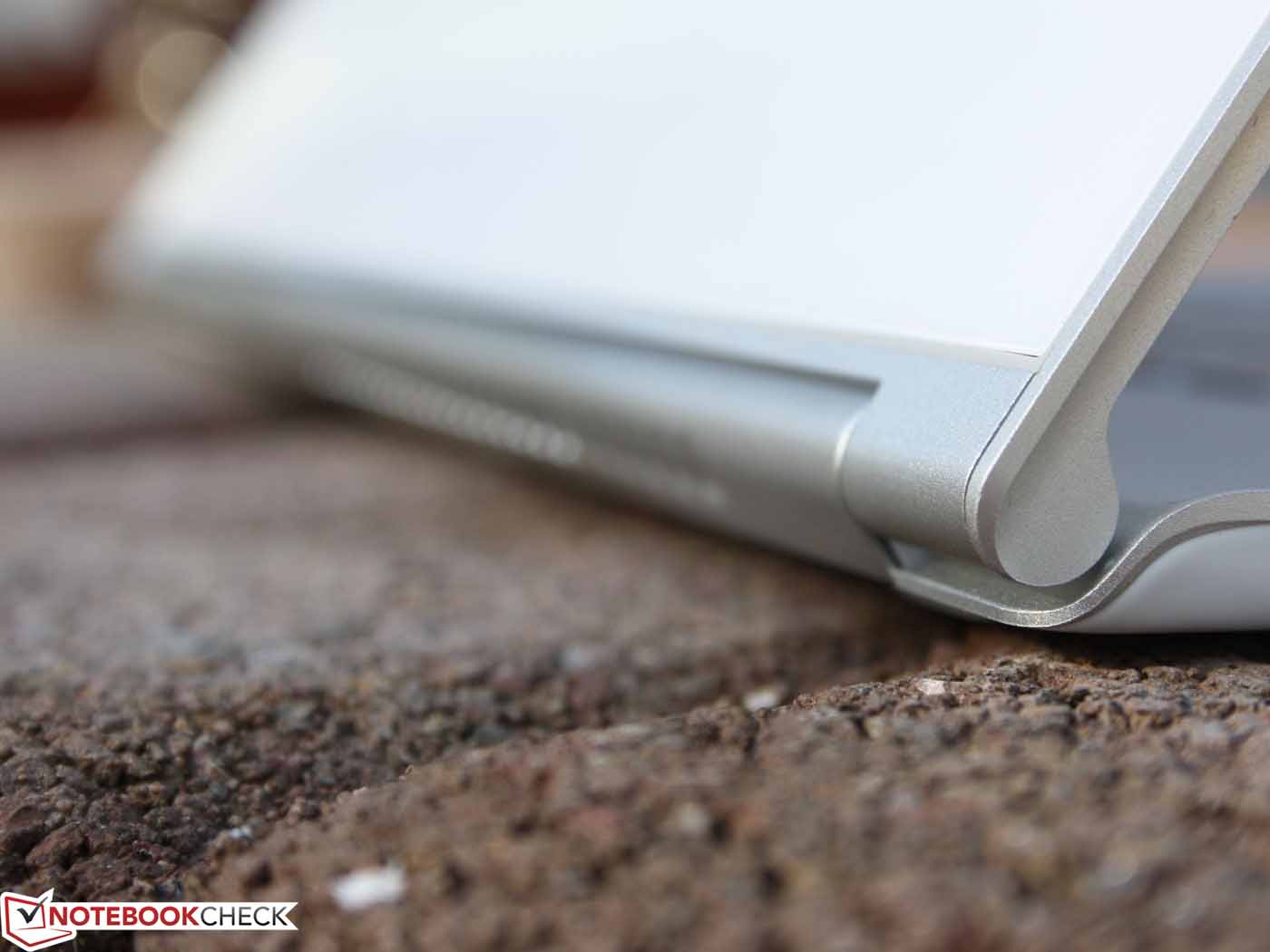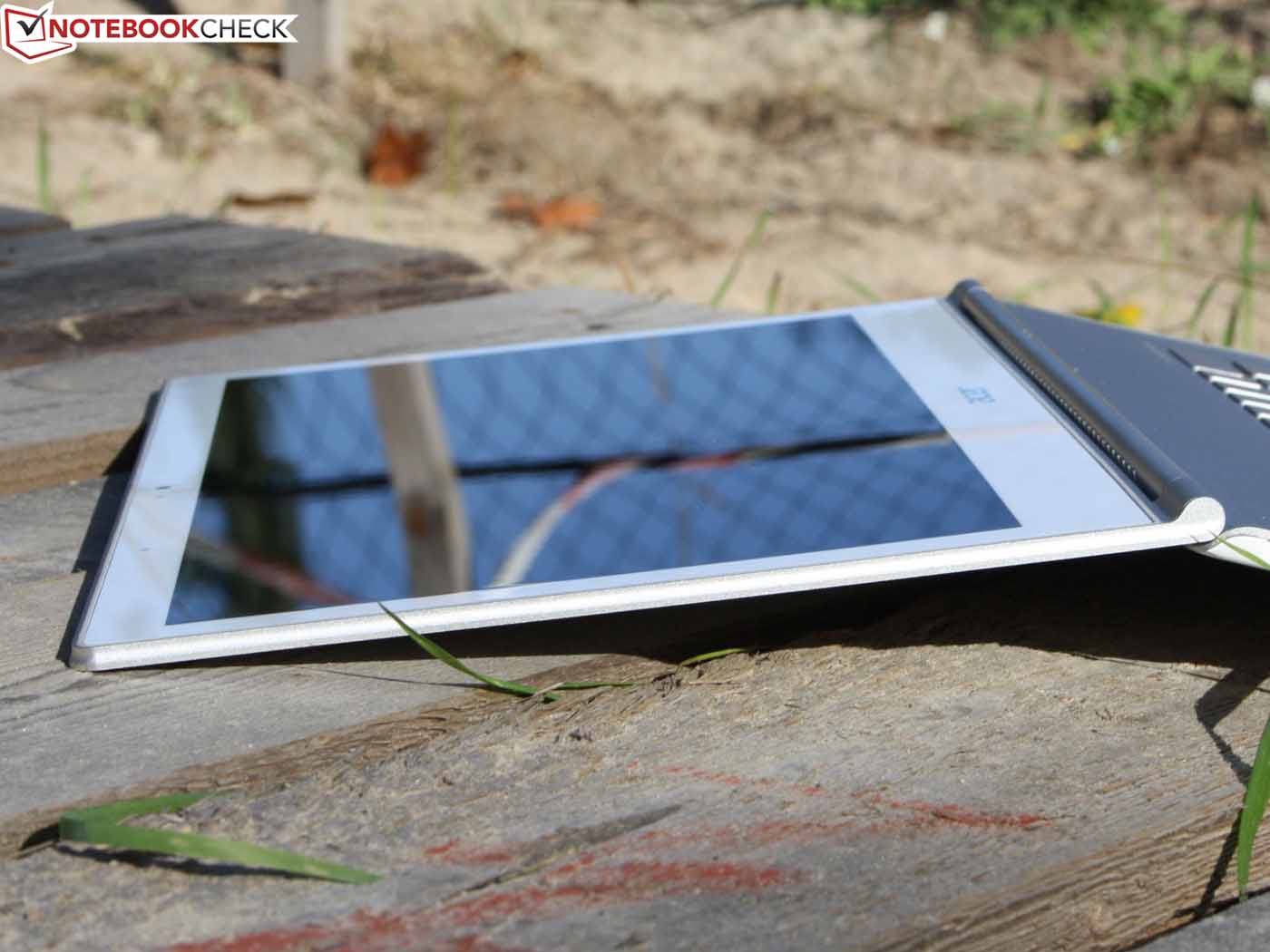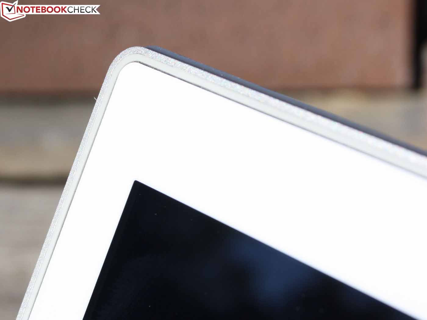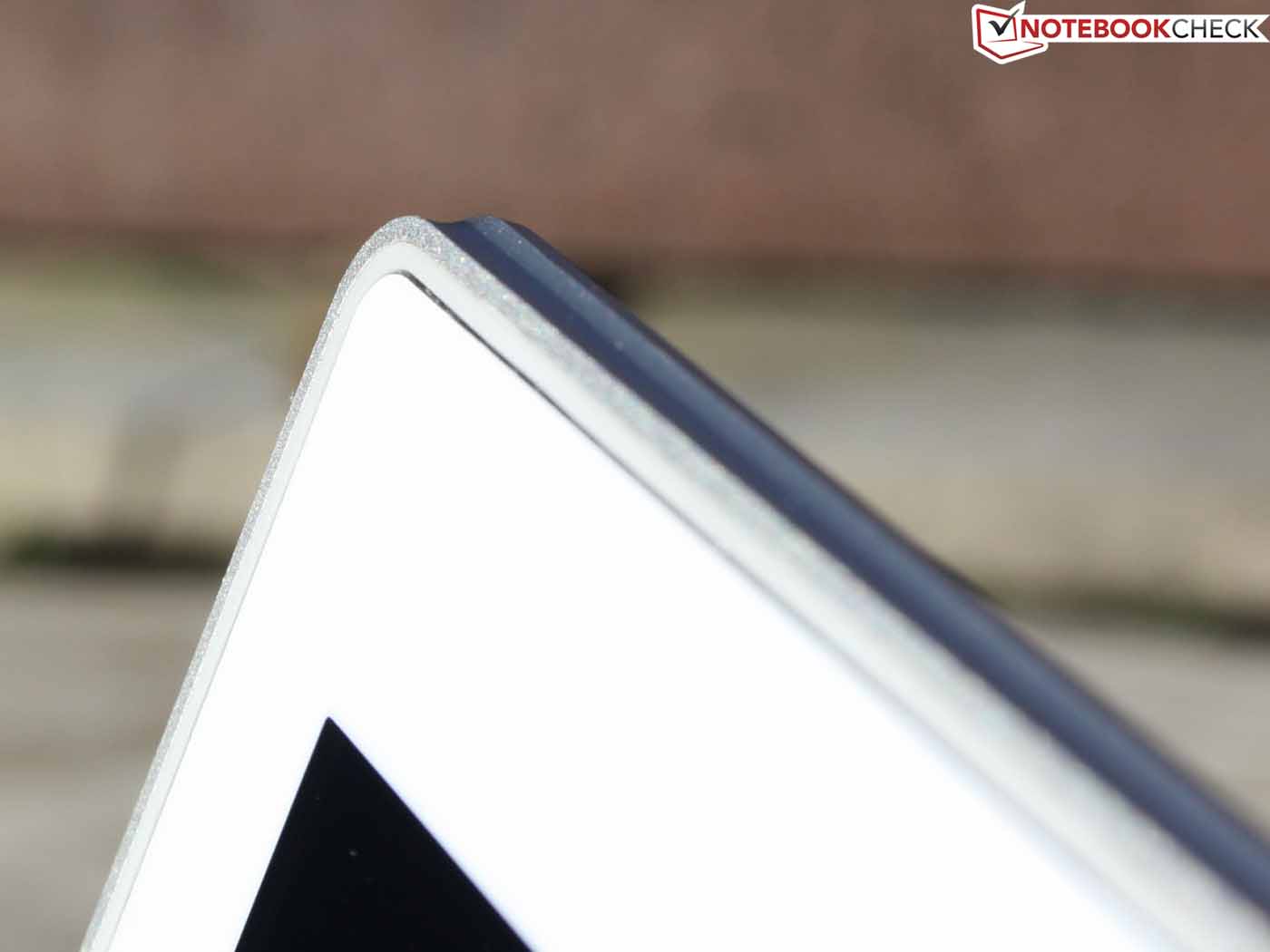 Das Full-HD-Panel besitzt eine homogene Oberfläche im Edge-to-Edge-Look. Wie beim Tablet-PC gibt es also keinen Bruch zwischen Rahmen und sensitiver Fläche. Die bündig aufliegende, umlaufende Gummilippe stört auch nicht die Bewegung der Finger. Es handelt sich um eine relativ strapazierfähige TFT-Oberfläche, an die Druckfestigkeit von guten Tablet-Computern kommt es aber nicht heran. Mittlerer Druck auf das Panel erzeugt die bei Notebooks typischen Druckstellen. Diese entstehen im Übrigen auch bei mittlerem Druck auf das Gorilla Glas der Deckelrückseite.