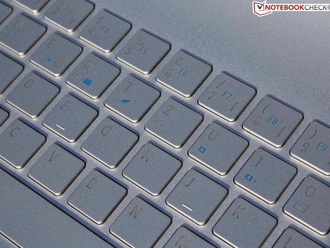 Die geringe Höhe des Notebooks mindert naturgemäß den Tasten-Hub. Das ist auch hier der Fall. Der feste Anschlag (Tasten liegen fest auf) sorgt zumindest für ein angemessenes Feedback. Der Druckpunkt ist ausreichend deutlich, aber nicht knackig, was bei diesem knappen Hub in Ordnung geht. Die Konkurrenten bieten alle ebenfalls keinen deutlichen Tastenhub.