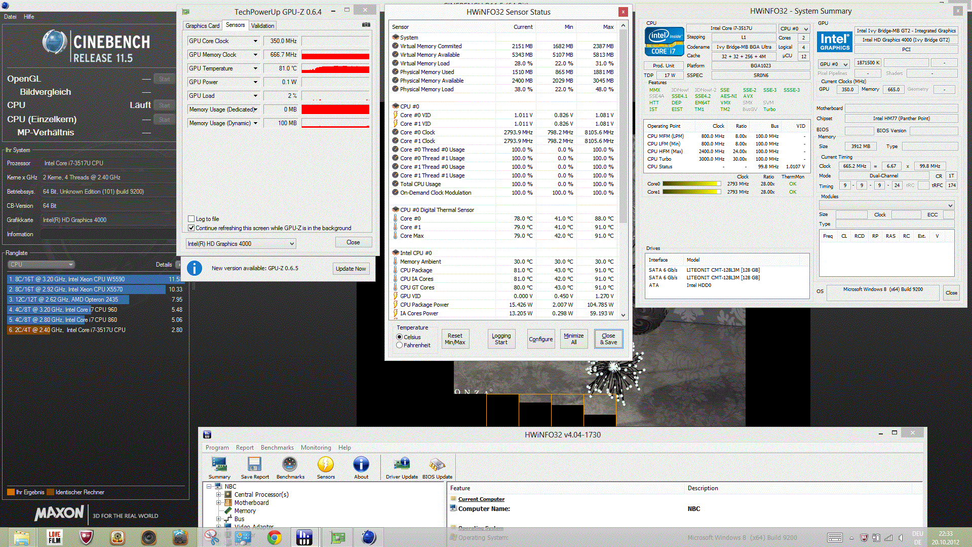 Kurz gesagt, es gibt zwei leistungsbestimmende Faktoren: Die GPU-Taktspanne (z. B. 650-1350 MHz) und die Wärmeabführung des Kühlsystems. Unser Core i7 3517U lässt seiner HD 4000 Spielraum bis 1150 MHz (theoretisch), mehr sind es auch in einem Standard Voltage Core i5 nicht. Genügt die Kühlung, um diesen Takt konstant aufrecht zu halten? Scheinbar nicht, denn im R11.5-OpenGL-Test schwankt selbiger zwischen 950 und 1.050 MHz.