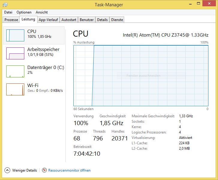 Alle Ergebnisse der synthetischen Benchmarks haben wir nachfolgend aufgelistet. Für ein Tablet ist die Leistung beachtlich, für einen Laptop ist sie aber nur in Ordnung. Die kurzzeitige Verwendung von Desktop-Programmen oder sogar ausgedehntes Surfen im Internet mit einigen geöffneten Tabs sind kein Problem, bei der gleichzeitigen Verwendung von mehreren Anwendungen kommt man aber schnell an die Grenze der 2 GB Arbeitsspeicher. Die Festplattengeschwindigkeit ist im Vergleich zu Laptops mit konventionellen HDDs gut, kann aber nicht mit den schnelleren SATA-SSDs mithalten. Das System startet schnell, was einen enormen Vorteil gegenüber Laptops mit herkömmlichen Festplatten darstellt.