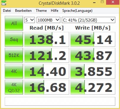 Die Solid State Disk im Acer Aspire Switch verwendet die eMMC-Anbindung anstelle der SATA-Schnittstelle. Gegenüber rotierenden Festplatten ist der Speicher kleiner, leiser, robuster, verbraucht weniger Strom, hat kürzere Zugriffszeiten und überzeugt bei vielen Aktivitäten mit schnelleren Transferraten beim Lesen sowie Schreiben. SATA-SSDs können deutlich schneller sein, für solch ein energiesparendes und günstiges System ist eine eMMC-basierte SSD aber die perfekte Lösung. Bei der genaueren Analyse liegt der Speicher ungefähr auf dem Niveau des Asus Transformer T100 und deutlich über dem alten Acer Iconia W510. Wenn sich der Anwender mit einem Windows-Account anmeldet, gibt es die Möglichkeit, die Festplatte via Bitlocker zu verschlüsseln. Der Flash-Speicher ist auf dem Mainboard aufgelötet.