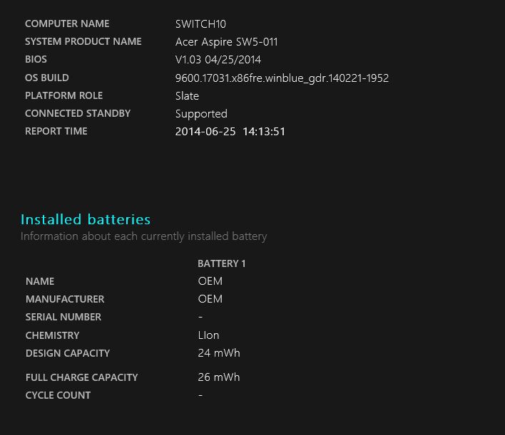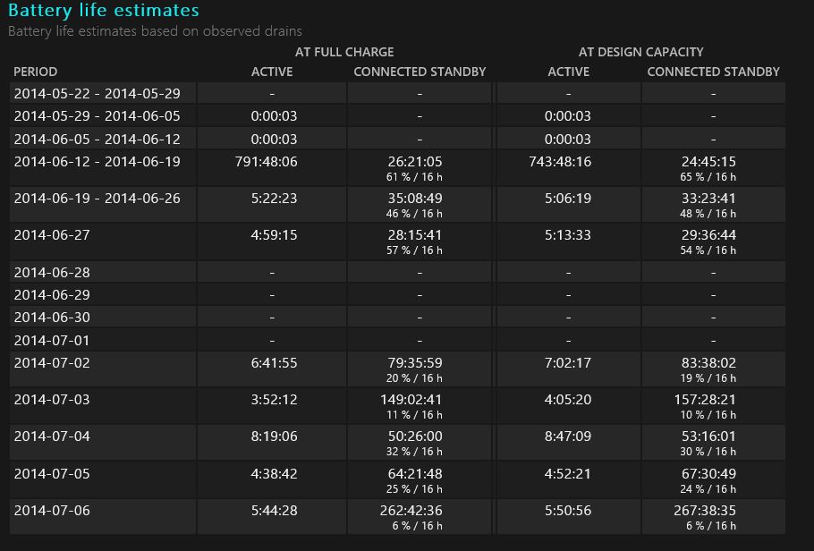 Powercfg, ein Kommandozeilen-Tool, wurde verwendet um einen Bericht nach einwöchiger Nutzung zu erstellen. Die geschätzten Laufzeiten (basierend auf 100 % Akkukapazität) für die Benutzung mit aktiviertem Bildschirm liegen zwischen 3 Stunden und 52 Minuten und 8 Stunden und 19 Minuten. Um solch einen Bericht unter Windows 8 zu erstellen, müssen Sie lediglich "powercfg -batteryreport" in die Kommandozeile eingeben.