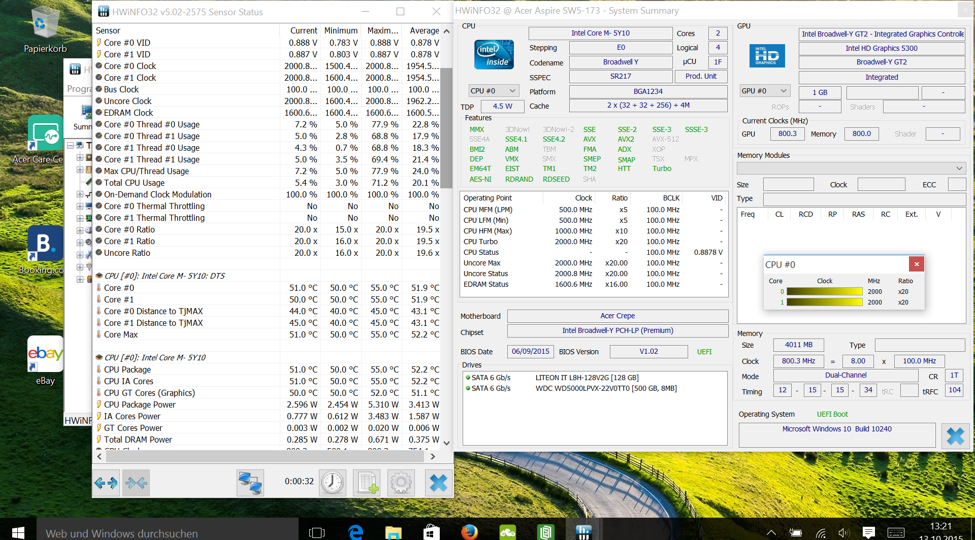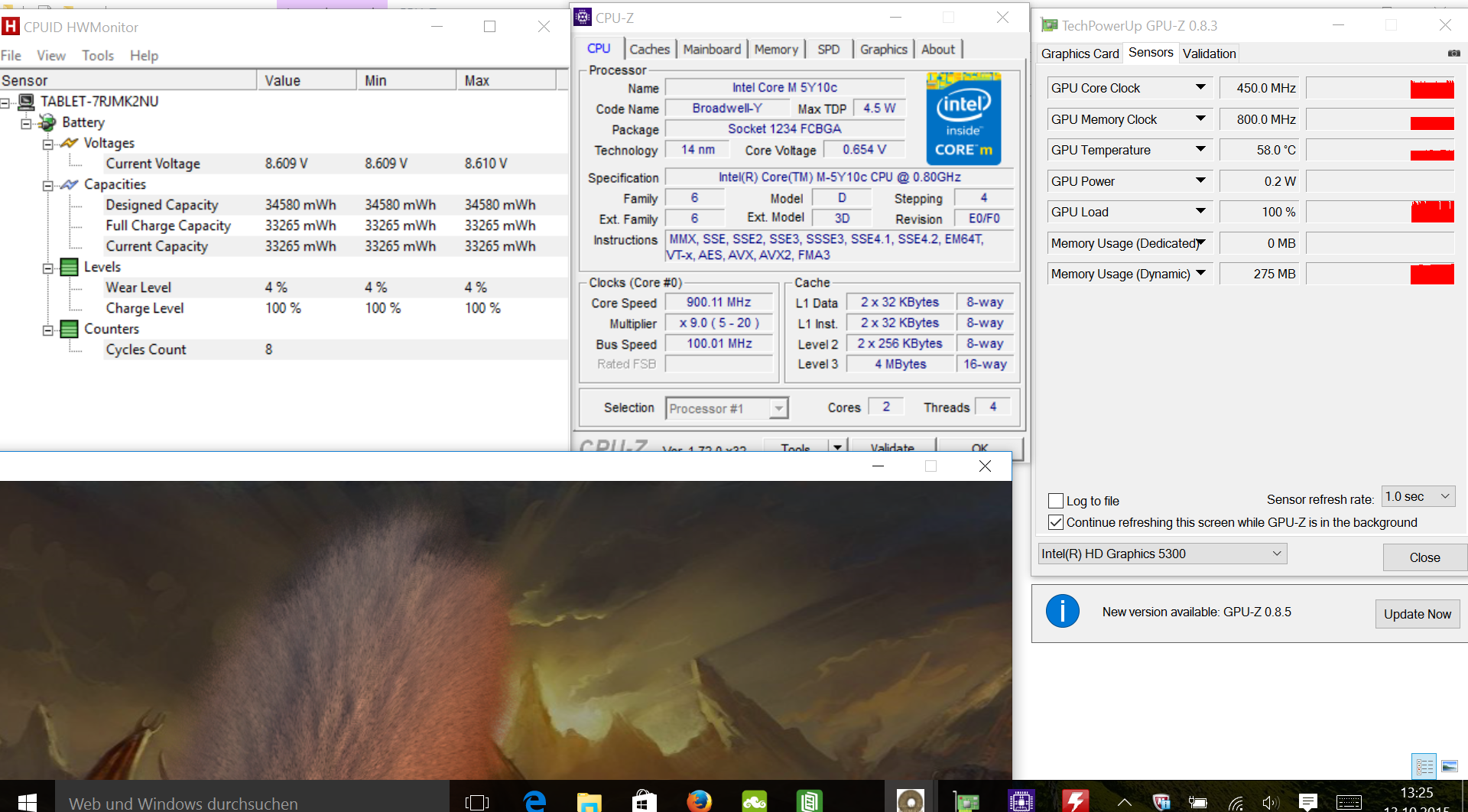 Mit dem Intel Core M 5Y10c steckt ein alter Bekannter im flachen Tablet: Das 4,5-Watt-SoC (Broadwell) wurde zur IFA 2014 erstmals gesichtet und steckte später unter anderem im Aspire Switch 12 oder auch im Lenovo Yoga 3 11. Es handelt sich um den sparsamsten Broadwell Kern, entwickelt für Tablets und besonders flache, lüfterlose Formfaktoren. Zusammen mit der internen Grafikkarte Intel HD Graphics 5300 und dem schnellen Massenspeicher steht eine Gesamt-Performance zur Verfügung, die für Windows 10, Office-Tätigkeiten oder Entertainment locker genügt. Anspruchsvollere Rechenarbeiten sollte man dem SoC im Tablet nicht zumuten, die Wartezeiten sind dabei schlichtweg deutlich länger als bei Notebooks mit 15-Watt-ULV-SoC bzw. 37-Watt-Standard-Mobilprozessor. Wer sich mit Real-Time-Audio-Aufzeichungen beschäftigt, den lassen Latenzen aufhorchen. Solche hat LatencyMon entdeckt.