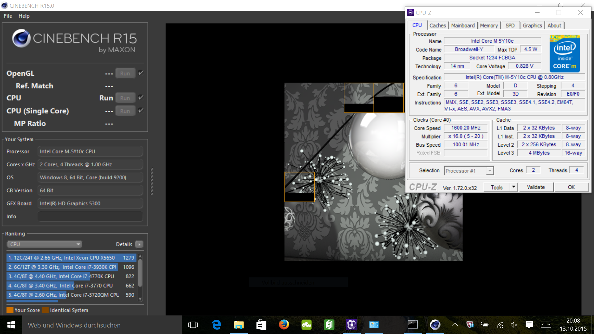 Die TDP kann vom Hersteller je nach Formfaktor und Kühloptionen konfiguriert werden, die Spanne von 3,5 bis 6 Watt ist möglich. Wir sind gespannt, was Acer hier möglich macht. Den Multi-CPU-Test des Cinebench R15 absolviert der Prozessor bei anfänglich 1,7–1,8 GHz, rechnet dann aber konstant mit 1,6 GHz. Hierbei ist es gleich, ob das System am Netz oder am Akku hängt, Taktung wie auch Ergebnis-Scores bleiben dieselben. Die Balken zeigen deutlich die Unterlegenheit eines Celeron N3050 (TDP 6 Watt), wie er im Low-Cost-Modell Aspire R11 R3-131T eingesetzt wird.