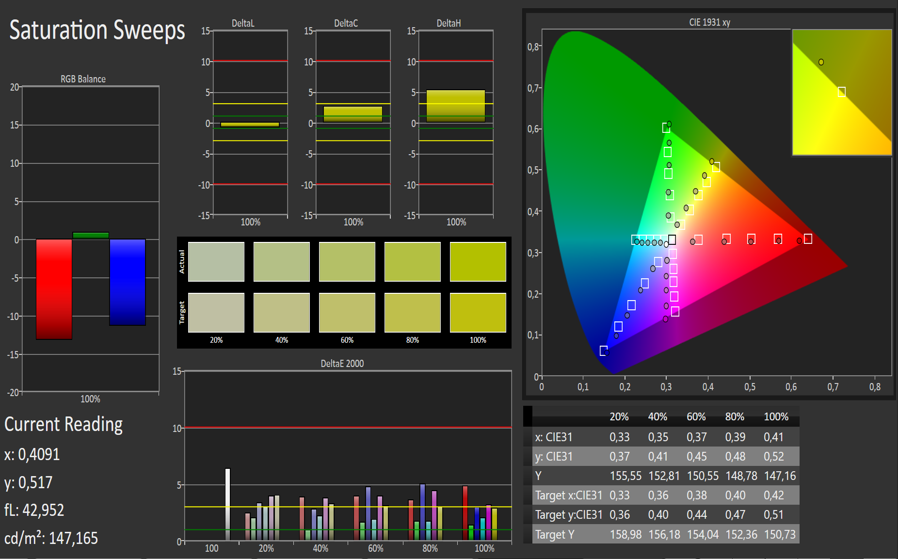 | sRGB Coverage (%) | 96.1 | 93 -3% | 73.7 -23% | 96.5 0% | 88.8 -8% | 97.4 1% |