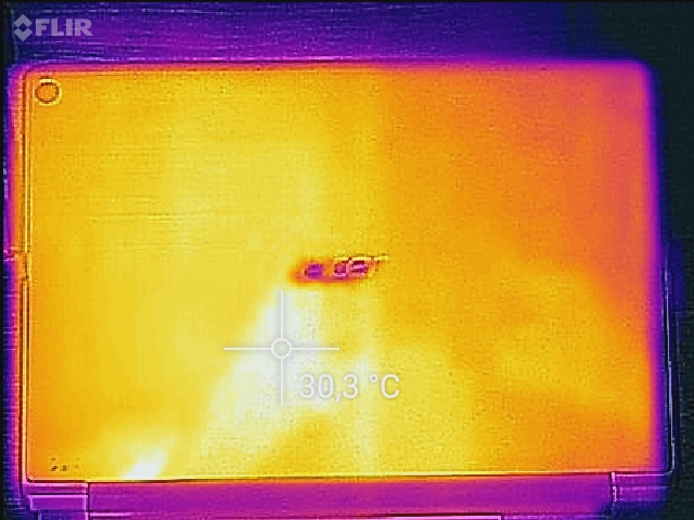 Das Alpha 12 bleibt im Leerlauf kühler als etwa das Core m betriebene Huawei MateBook (knapp 30 Grad). Wir messen im Schnitt 27 Grad auf Unter- und Oberseite. Zur Sache geht es im Stresstest bzw. unter Dauerlast: Jetzt steigt schon der Durchschnitt auf 44 Grad, punktuell messen wir 49 Grad, siehe Wärmebild-Aufnahmen. Diese Temperaturen möchte man nur im Schreibtisch-Einsatz haben, ohne Kontakt mit den Händen. Der Stresstest ist außerdem ein Extremszenario, das im Alltag nicht so schnell auftreten dürfte.