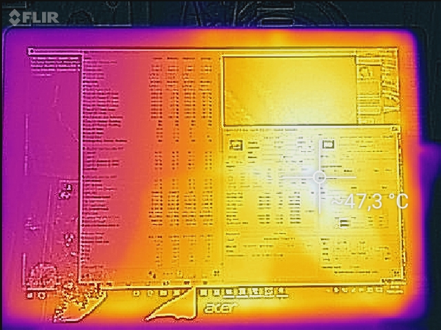 (-) Auf der Unterseite messen wir eine maximalen Wert von 47.8 °C (im Vergleich zum Durchschnitt von 36.8 °C).