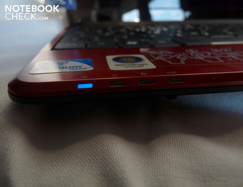Der Betriebsstatus, die Akkufunktion, sowie Bluetooth und WLAN-Aktivität werden über 4 Leuchten am unteren Gehäuserand angezeigt, die blau (bei ladendem Akku orange) leuchten. Die blaue Beleuchtung setzt sich beim Einschalter sowie den Statusleuchten für Festplattenaktivität, NumLock und Feststelltaste links über der Tastatur fort. Gut, dass Acer diese Lämpchen klein gehalten hat, so dass sie einem beim Betrachten des direkt darüber befindlichen Monitors auch im Dunkeln nicht blenden.