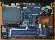 Gut gelungen ist die Wartbarkeit des Gehäuses: Der 2.5"-Slot, mSATA-Slot der SSD, WLAN-Karte und der einzelne Speicherslot sind durch eine Wartungsklappe einfach erreichbar. Die gesamte Oberschale inklusive Tastatur kann auch ohne Weiteres abgenommen werden. Einfach die Kreuzschrauben auf der Unterseite und in den Fächern (Achtung: zwei im DVD-Schacht) lösen. Tastatur und Trackpad sind dann noch per Flachbandkabel verbunden. Das Lösen geht zwar relativ unkompliziert, aber besonders das Touchpadkabel wieder zu befestigen, ist sehr sehr fummelig. Für den erfahrenen Benutzer ist somit auch der Lüfter zu erreichen und kann gereinigt werden.