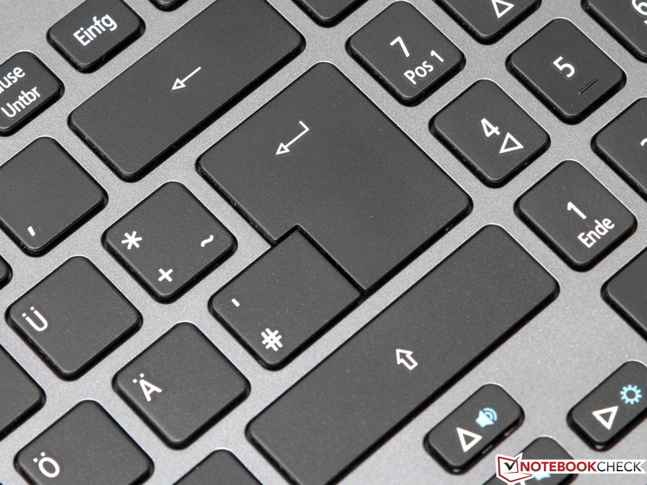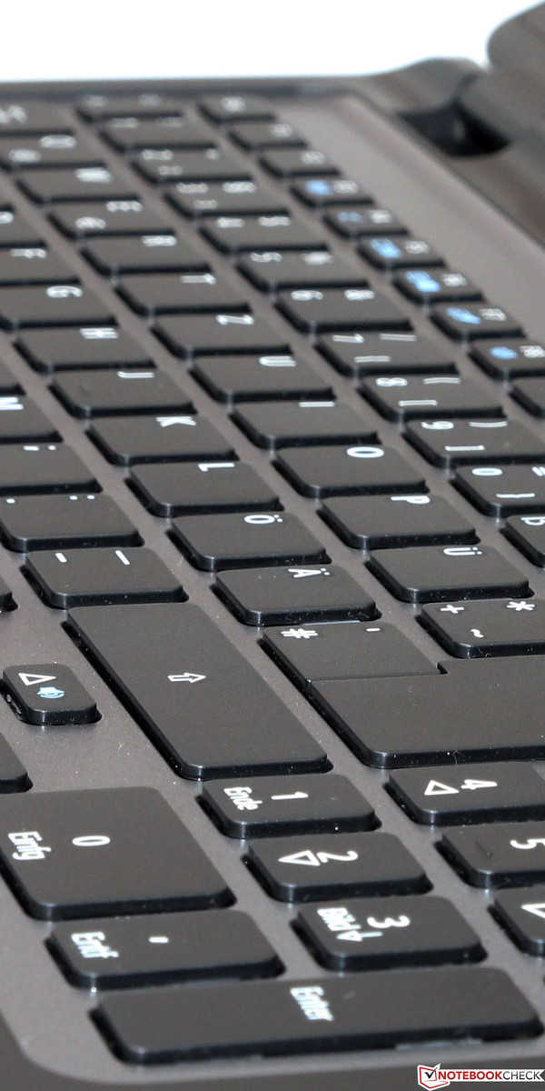 Dank des breiten 15-Zoll-Gehäuses konnte der Hersteller eine großzügige Chiclet-Tastatur samt integriertem Ziffernblock verbauen. Die in grauen Kunststoff eingefassten, knapp 15 x 15 Millimeter großen Tasten besitzen eine angenehm griffige Oberfläche, jedoch keine Hintergrundbeleuchtung. Einige kleinere Layout-Besonderheiten, unter anderem die sehr klein geratene linke Umschalttaste, erfordern eine gewisse Eingewöhnungszeit; davon abgesehen entspricht das Design jedoch dem gängigen Standard.