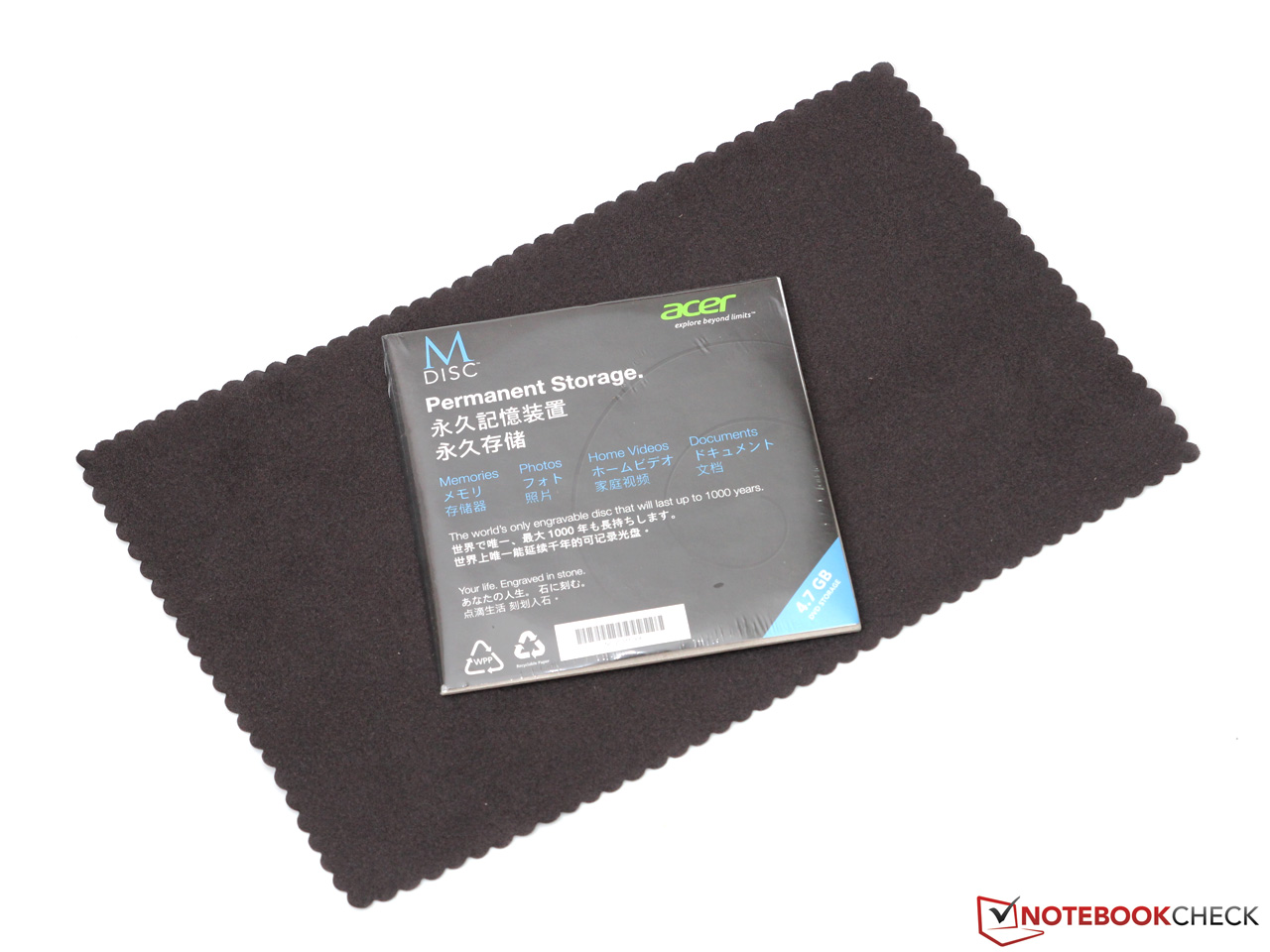 In der Verpackung des Notebooks finden wir neben einem 65-Watt-Netzteil auch noch das übliche Broschüren-Paket sowie ein praktisches Staubtuch – bei einem Touchscreen ist selbiges auch dringend notwendig. Besonderes Highlight ist aber der ebenfalls beigelegte M-Disc-Rohling: Dieser Datenträger kann mit dem internen Brenner beschrieben und im Anschluss von jedem DVD-Laufwerk gelesen werden – und soll laut Hersteller satte 1.000 Jahre halten.