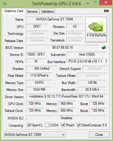 Die erst zu Jahresbeginn vorgestellte Nvidia GeForce GT 730M kennen wir bereits aus dem Acer Aspire V3-571G. Obwohl die Bezeichnung eine neue GPU-Generation suggeriert, verbirgt sich dahinter schlicht der bekannte Kepler-Chip GK107 – ebenfalls zu finden bei der GeForce GT 640M oder 650M. Mit 725 MHz taktet die 28-Nanometer-GPU (384 Shader-Einheiten) nur leicht höher als die GT 645M, kann sich per Turbo-Boost aber bis auf 895 MHz hochtakten. Als Resultat dessen ist die 730M kaum langsamer als die DDR3-Version der GT 650M (950 MHz Turbo). Bestückt wurde die Karte mit einem 1 GB großen Speicher (900 MHz, 128 Bit DDR3); üblicher sind eigentlich 2 GB VRAM, was in dieser Leistungsklasse aber keinen besonderen Unterschied macht.