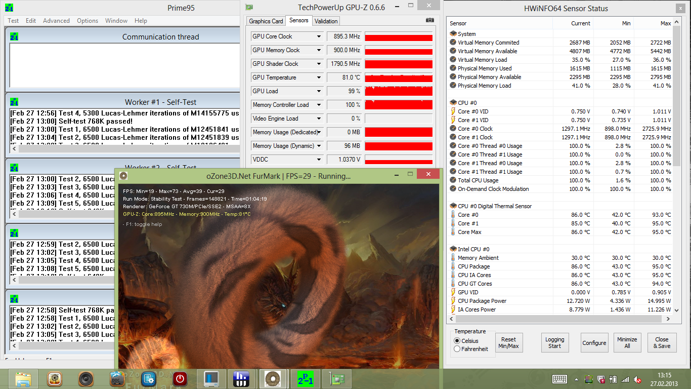 Auf der GPU-Seite stehen sich die im Prozessor integrierte HD Graphics 4000 (350 bis 1.100 MHz) sowie eine dedizierte GeForce GT 730M gegenüber. Je nach Anwendung wählt Nvidias Optimus dabei den optimalen Grafikprozessor aus: Einfache 2D-Programme nutzen die sparsame Intel-GPU, aufwändige 3D-Spiele werden von der GT 730M berechnet. Die Umschaltung geschieht unterbrechungsfrei und in den meisten Fällen auch vollautomatisch.