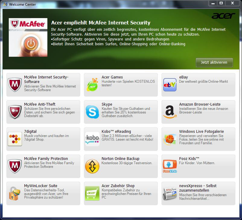 Zum Schutz des Geräts hat Acer das Programm "McAfee Internet Security Suite" vorinstalliert. Darüber hinaus findet sich auf dem Gerät noch das Programm "Cyberlink Mediaespresso". Das Programm wandelt Mediendateien in ein Format um, das auf Mobiltelefonen, Tablet und/oder Spielekonsolen nutzbar ist. Auch die Starter-Version von Microsoft Office 2010 wird mitgeliefert. Außerdem ist die Microsoft-Programmsammlung "Windows Live Essentials" (enthält beispielsweise ein E-Mail-Programm und ein Videoschnittprogramm) vorinstalliert. Zusätzlich ist eine 30-tägige Testversion von dem DVD- und CD-Brennprogramm "NTI Media Maker 9" vorinstalliert.