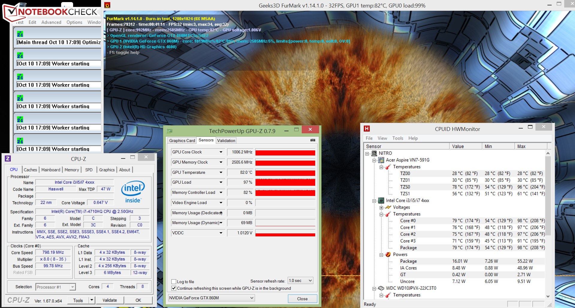 Unseren Stresstest (Prime95 und Furmark laufen für mindestens eine Stunde) durchläuft das Aspire sowohl im Netz- als auch im Akkubetrieb auf die gleiche Weise. Der Prozessor arbeitet nur wenige Sekunden mit vollem Takt und wird dann auf 800 MHz gedrosselt. Bei dieser Geschwindigkeit verharrt er die meiste Zeit. Selten gibt es Ausschläge nach oben (900/1.000 MHz). Der Grafikkern rechnet mit weitgehend voller Leistung (1.006 bis 1.071 MHz).