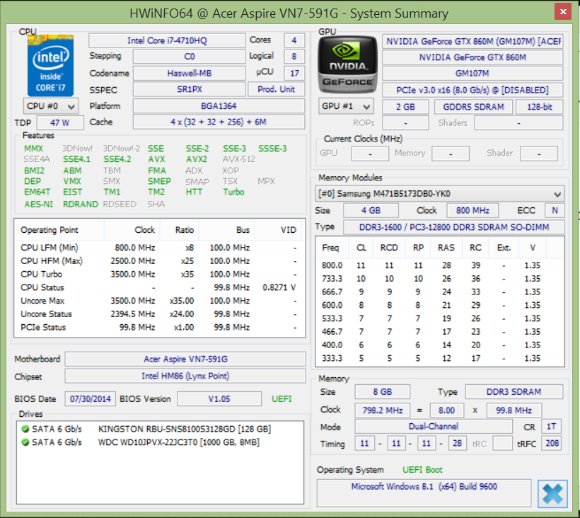 | Acer Aspire V 15 Nitro VN7-591G-77A9 GeForce GTX 860M, 4710HQ, Kingston RBU-SNS8100S3128GD | Lenovo IdeaPad Y50 GeForce GTX 860M, 4700HQ, Western Digital WD10S21X SSHD 1TB + 8GB SSD-Cache | MSI GE60-2PEi781B GeForce GTX 860M, 4700HQ, WDC Scorpio Blue WD10JPVX-22JC3T0 | Acer Aspire V5-573G-54218G1Taii GeForce GTX 850M, 4210U, Seagate ST1000LM014 Solid State Hybrid Drive | Gigabyte P35W v2 GeForce GTX 870M, 4710HQ, 2x Lite-On LMT-128M6M (RAID 0) | |
