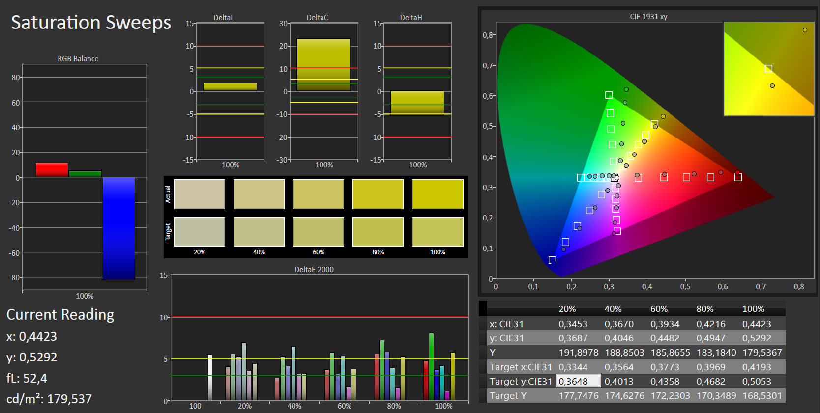 | Delta E Graustufen * | 4.73 | 9.23 -95% | 10.84 -129% | 10.04 -112% | 3.94 17% | 5.01 -6% | 6.24 -32% | 11.68 -147% |
