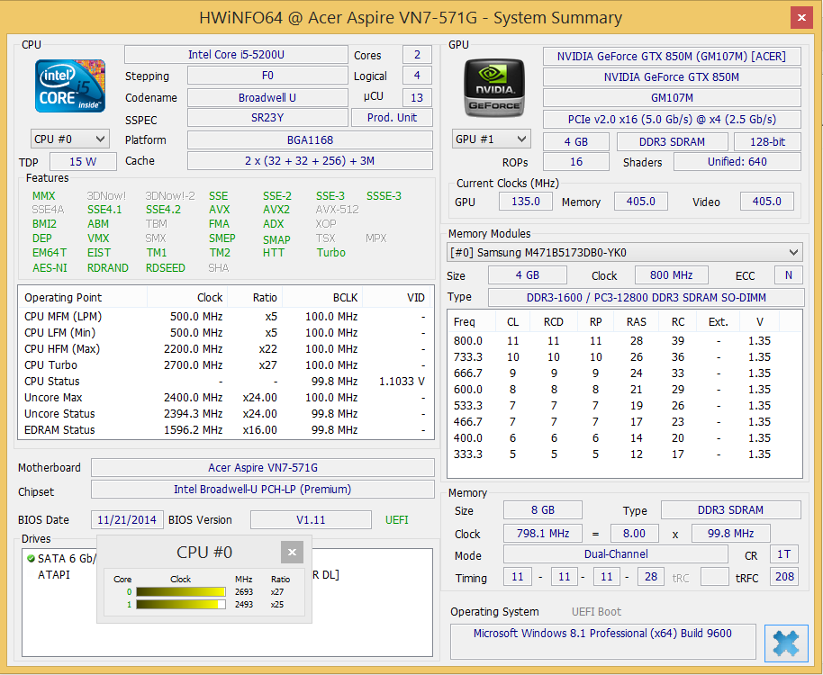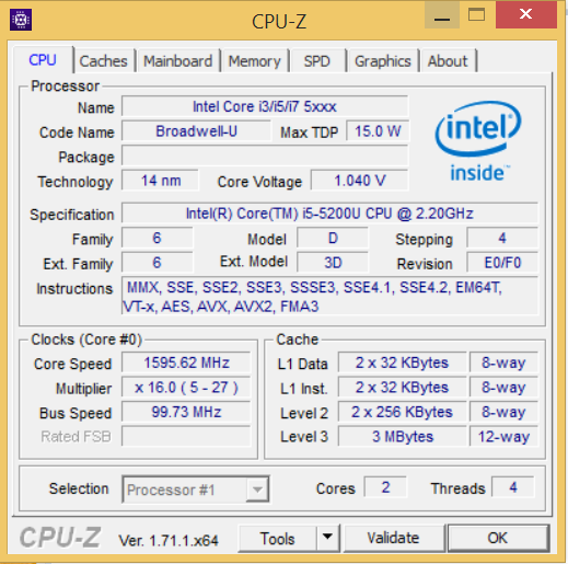 Die Broadwell-CPU des Aspire trägt die Bezeichnung Core i5-5200U. Es handelt sich hierbei um einen Zweikernprozessor. Dieser arbeitet mit einer Basisgeschwindigkeit von 2,2 GHz. Mittels Turbo kann die Geschwindigkeit auf 2,5 GHz (beide Kerne) bzw. 2,7 GHz (nur ein Kern) erhöht werden. Der Turbo kommt im Netz- und im Akkubetrieb zum Einsatz. Was wir auch schon bei anderen Notebooks festgestellt haben, bestätigt sich beim Aspire ebenfalls: Der Broadwell-Prozessor verbucht gegenüber seinen Haswell-Vorgängern (Core i5-4200U, Core i5-4210U) ein Leistungsplus von 5 bis 15 Prozent. Dafür sind die etwas höheren Arbeitsgeschwindigkeiten des Core i5-5200U Prozessors und die Verbesserungen der Broadwell-Architektur verantwortlich.