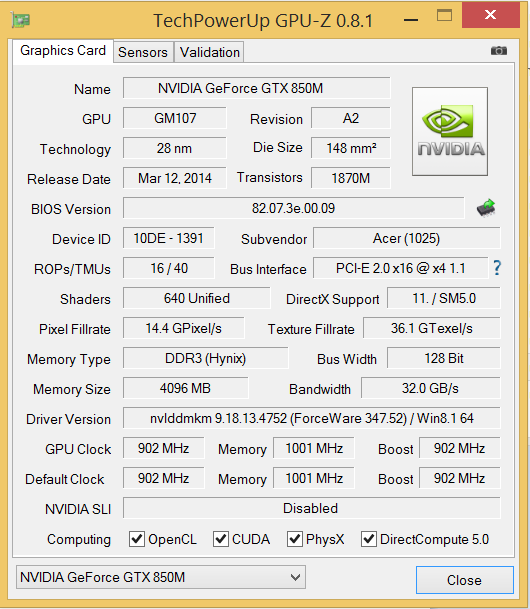 Der GeForce Kern gehört der oberen GPU-Mittelklasse an. Er arbeitet mit einer Basisgeschwindigkeit von 902 MHz. Per Turbo kann die Geschwindigkeit auf 1.084 MHz erhöht werden. Die Ergebnisse in den 3D Mark Benchmarks liegen in der erwarteten Höhe vor. Allerdings liefern die meisten von uns getesteten GeForce-GTX850M-Notebooks etwas bessere 3D-Mark-Resultate, da sie mit stärkeren Standard-Mobilprozessoren (kein ULV) bestückt sind. Das Aspire stellt erst das vierte von uns getestete Notebook dar, das auf eine Kombination aus GeForce GTX 850M GPU und ULV-Prozessor setzt.