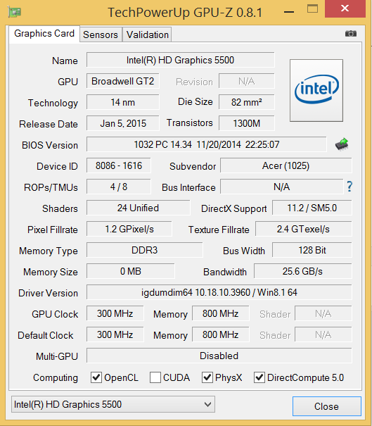 Zwei Grafikkerne hat Acer dem Aspire spendiert: Intels HD Graphics 5500 GPU und Nvidias GeForce GTX 850M Grafikkern. Diese bilden eine Umschaltgrafiklösung (Optimus). Während Intels Chip im Alltags- und Akkubetrieb zum Einsatz kommt, findet Nvidias GPU bei leistungshungrigen Anwendungen wie Computerspielen Verwendung. Die Umschaltung erfolgt automatisch. Der Nutzer könnte aber jederzeit eingreifen und auswählen, welche Anwendung mit welcher GPU ausgeführt werden soll.