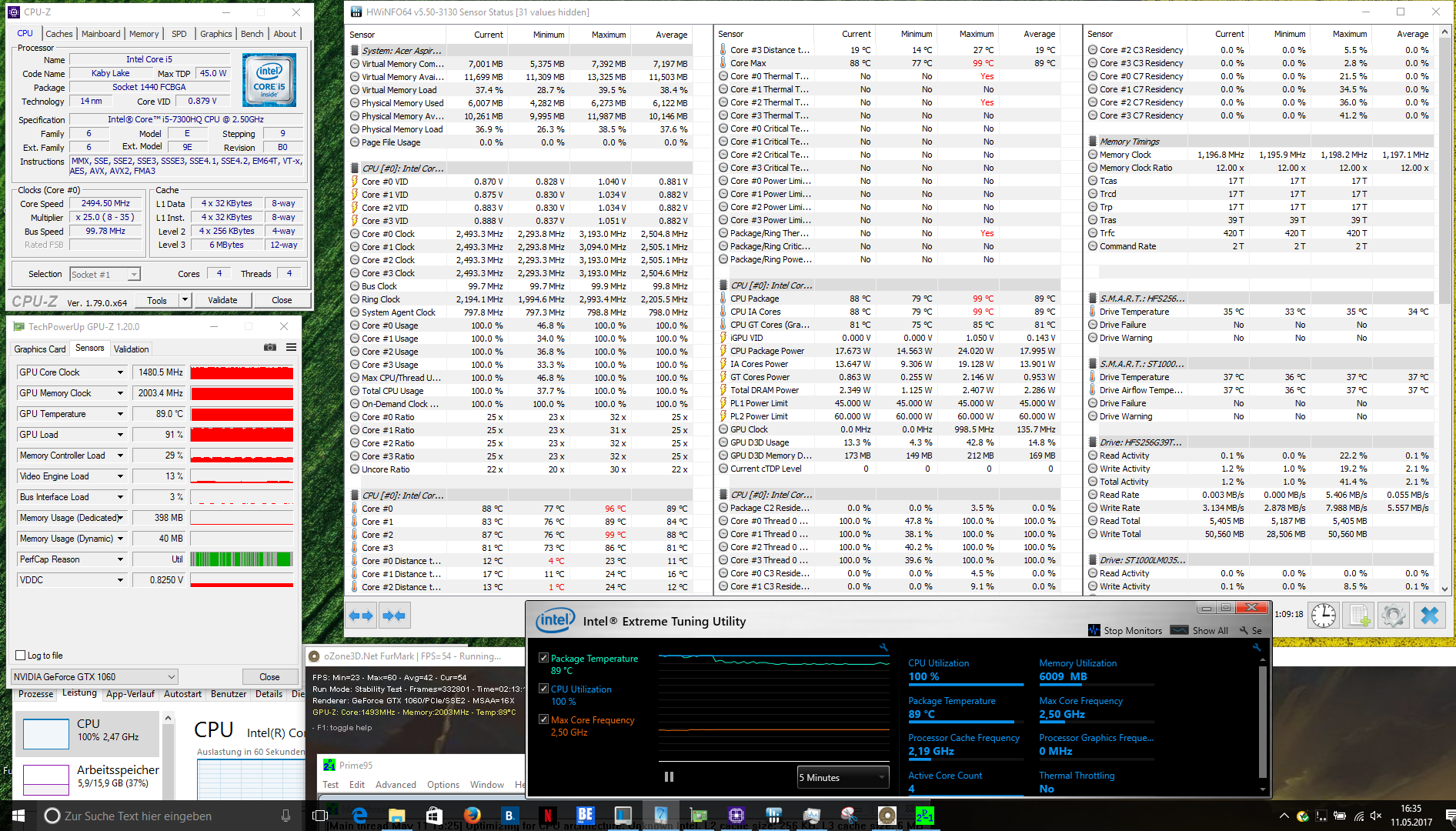 Bei unserem Stresstest, bei dem Prime95 und Furmark für mindestens eine Stunde gleichzeitig laufen, erhitzte sich der Prozessor auf 99 °C. Bei der Grafikkarte haben wir mit 89 °C den Höchstwert notiert. Somit wird durch die gleichzeitige Belastung von CPU und GPU die thermale Grenze des Prozessors erreicht, weshalb dieser leicht gedrosselt werden muss. Mit 2,5 GHz arbeitete der Prozessor im Durchschnitt bei unserem Stresstest mit beiden Programmen. Wird der Stresstest nur mit dem Programm Prime95 durchgeführt, so messen wir bei Prozessor maximal 94 °C. Hierbei kommt es nicht zum Thermal-Throttling, und die CPU konnte zuverlässig die 3,1 GHz halten.