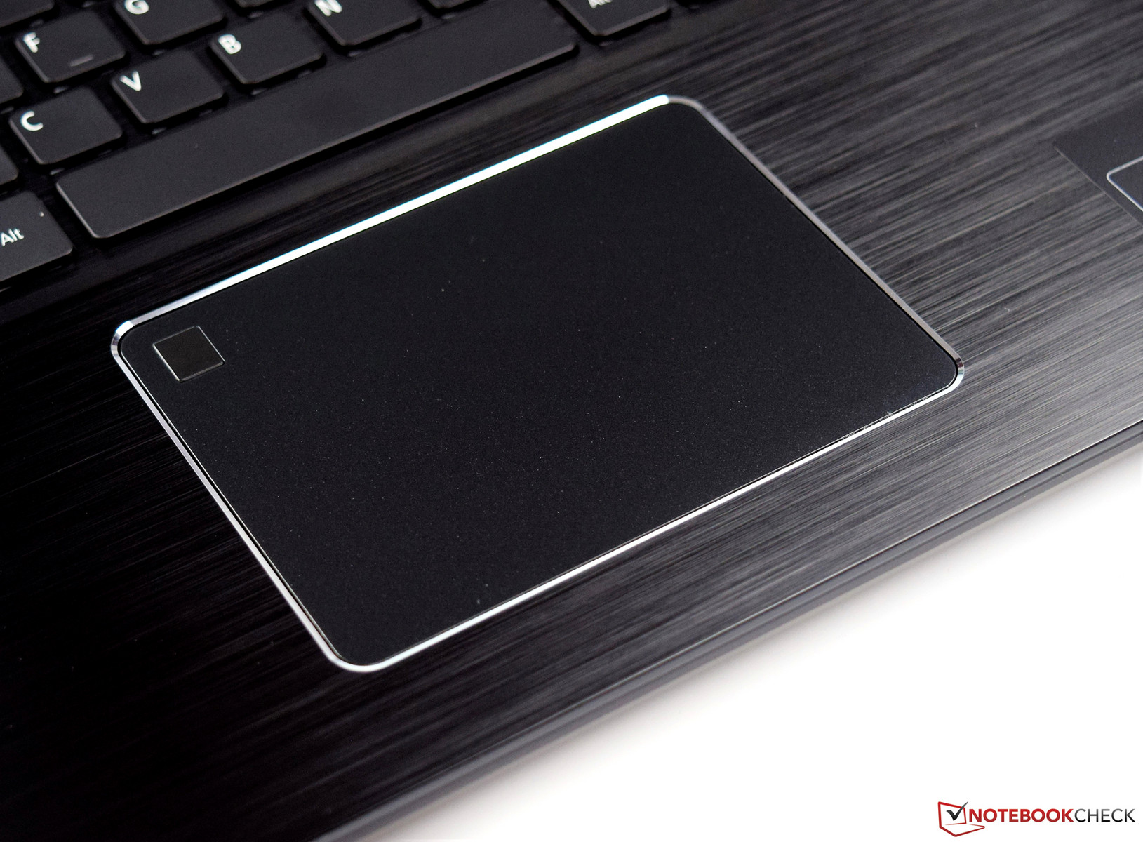 Das Touchpad wird in unserem Fall durch einen Fingerabdruck-Scanner erweitert. Dadurch wird ein kleiner Bereich in der linken oberen Ecke sozusagen unbrauchbar, denn dieser Bereich kann nicht zum Navigieren verwendet werden. Das Clickpad misst in Breite und Länge 10,7 X 7,9 Zentimeter. Damit bleibt dem Anwender trotzdem genügend Spielraum für Eingaben. Während des Testens kam es hier zu keinen nennenswerten Einschränkungen des Arbeitsbetriebes. Das Clickpad besitzt im unteren Bereich zwei Eingabetasten, welche bei Betätigung durch ein leises Klicken auf sich aufmerksam machen. Der Hubweg ist gering, und der Druckpunkt ist straff genug, um versehentliche Eingaben zu verhindern. Insgesamt gefällt das Touchpad, welches mit der glatten Oberfläche gute Gleiteigenschaften bietet. Zudem wird das Clickpad mit einer schräggefrästen Chromkante dezent in Szene gesetzt.
