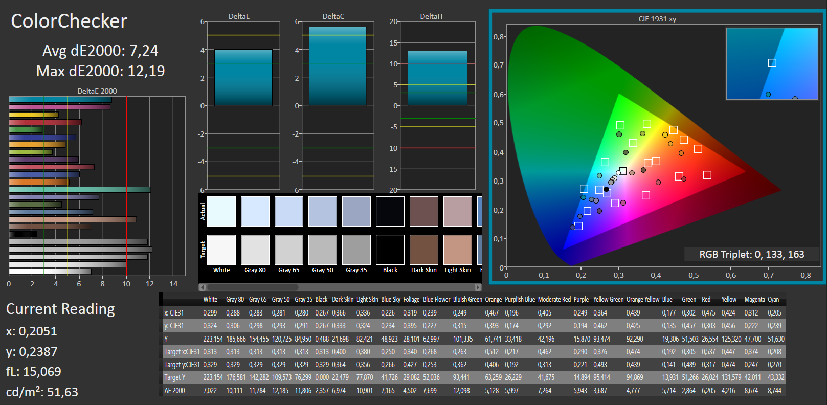 | Delta E Colorchecker * | 7.24 | 12.04 -66% | 8.83 -22% | 9.73 -34% | |