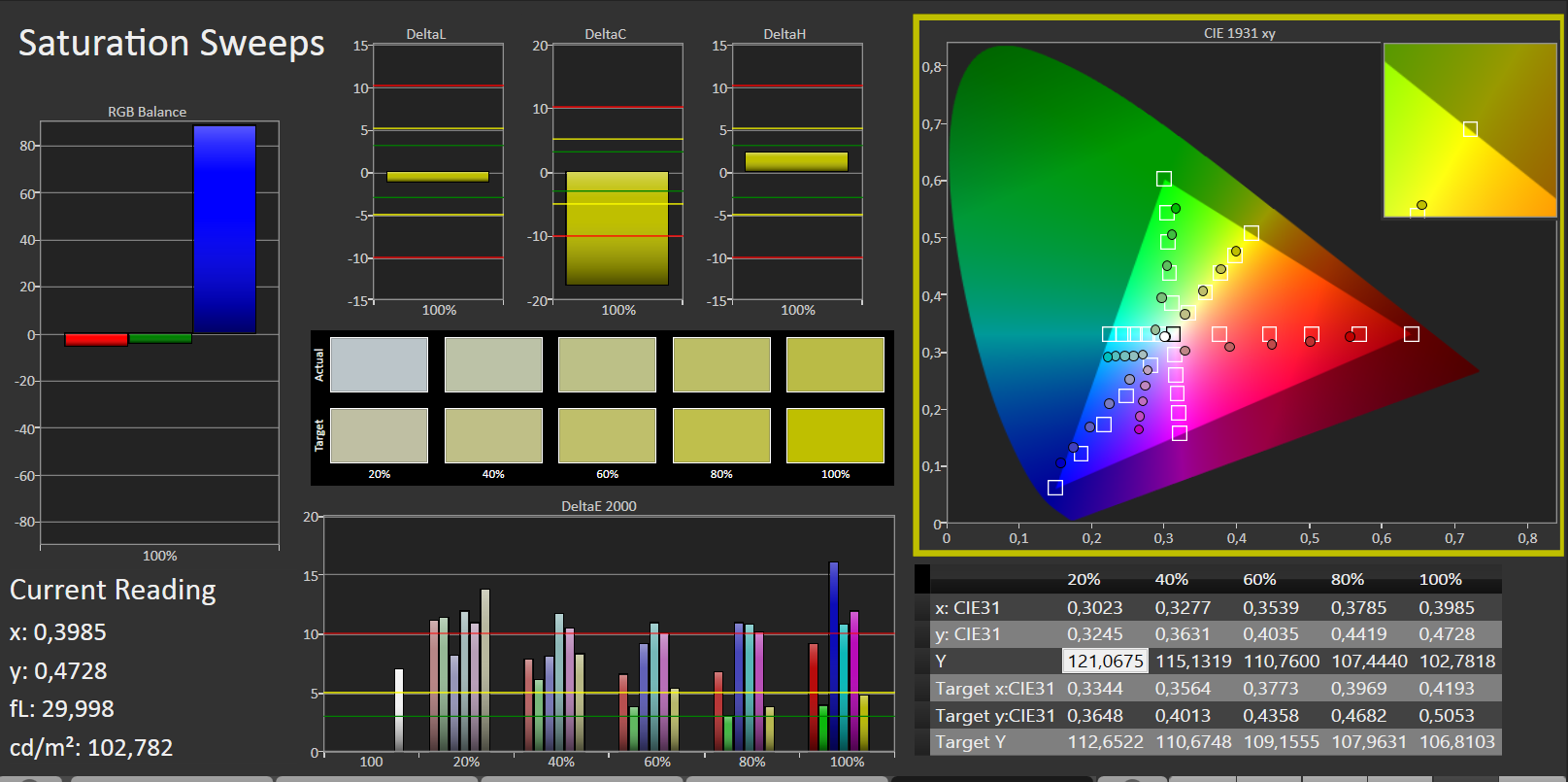 Im Auslieferungszustand kann der Bildschirm eine durchschnittliche DeltaE-2000-Abweichung von 7,24 vorweisen. Der Wert fällt besser aus als bei den meisten von uns vermessenen Bildschirmen (DeltaE zwischen 10 und 12). Den Zielbereich (DeltaE kleiner 3) erreicht er aber nicht. Darüber hinaus weist der Bildschirm einen Blaustich auf.