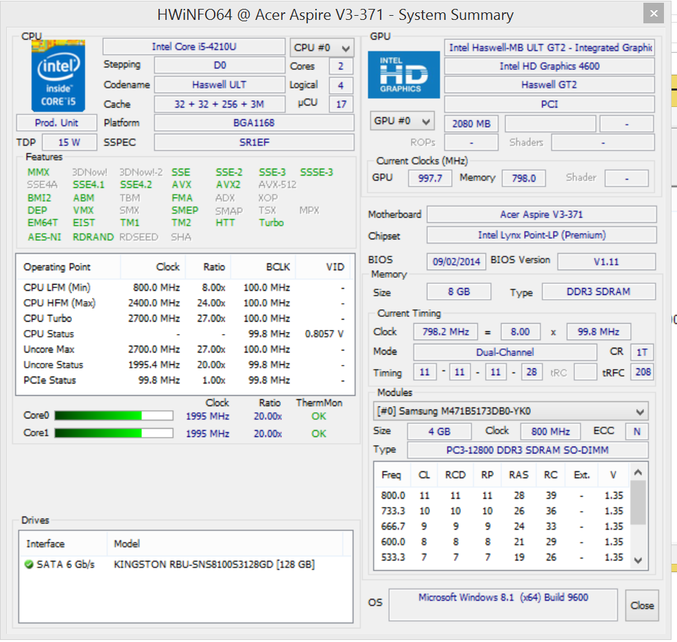| Acer Aspire V3-371-55GS HD Graphics 4400, 4210U, Kingston RBU-SNS8100S3128GD | Acer Aspire V3-331-P982 HD Graphics (Haswell), 3556U, Seagate ST500LM000 Solid State Hybrid Drive | Acer Aspire V3-371-36M2 HD Graphics 4400, 4030U, Seagate ST500LM000 Solid State Hybrid Drive | Lenovo M30-70 HD Graphics 4400, 4010U, Hitachi Travelstar Z5K500 HTS545050A7E380 | |