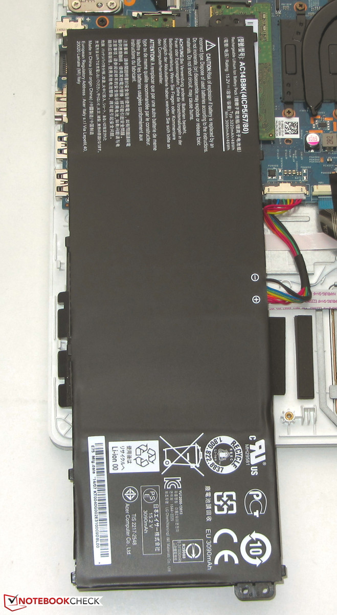 Wie bereits geschrieben, kann die Unterschale der Baseunit problemlos demontiert werden. Es besteht dann Zugriff auf den Arbeitsspeicher, die Festplatte, den Akku und den Lüfter. Der Rechner ist mit zwei Arbeitsspeicherbänken bestückt, die beide mit jeweils einem 4-GB-Modul belegt sind. Acer setzt beim Aspire auf eine Solid State Disk im M.2-Format (doppelte Länge). Die SSD könnte gegen ein Modell mit mehr Speicherplatz getauscht werden. Entsprechende Modelle mit einer Kapazität von 256 GB sind aktuell ab etwa 130 Euro zu bekommen. Auch der Akku könnte im Falle eines Defektes gewechselt werden. Er wird lediglich von zwei Schrauben gehalten.