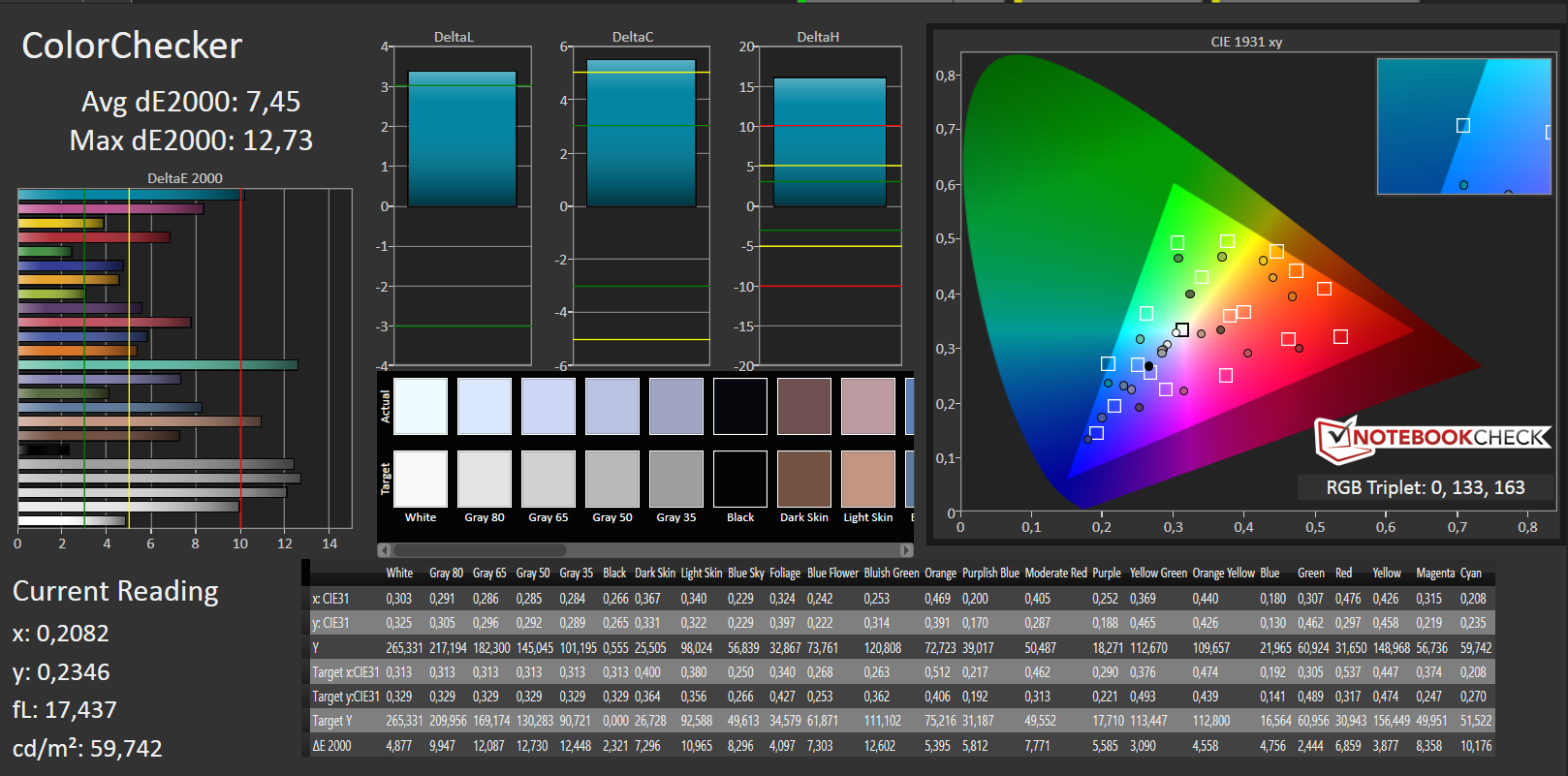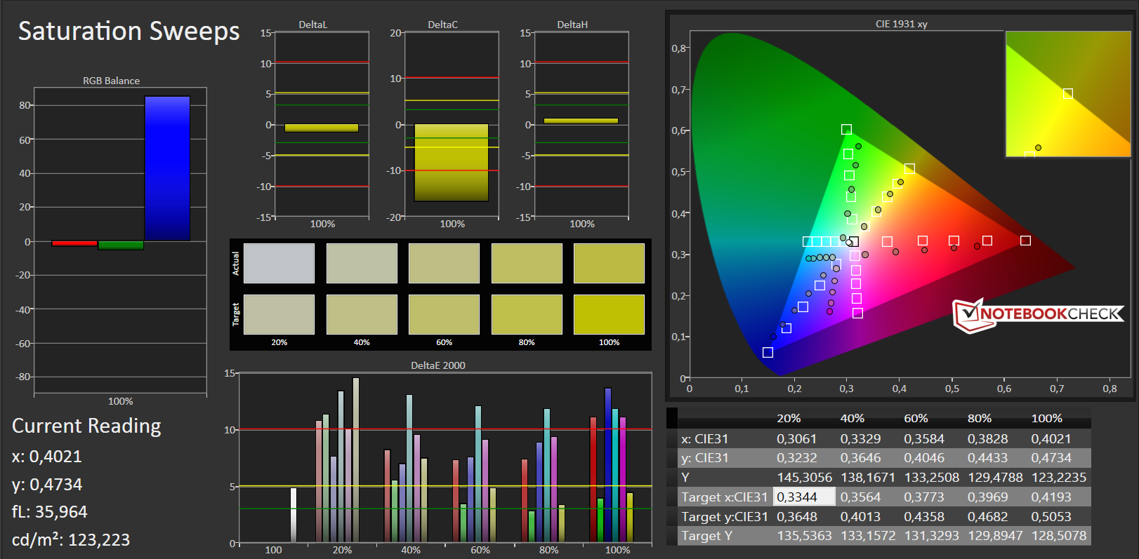 Von einem satten Schwarz kann aufgrund des niedrigen Kontrastwertes von 415:1 und eines Schwarzwertes von 0,59 cd/m² nicht die Rede sein. In den letzten 12 Monaten erzielten Subnotebooks einen durchschnittlichen Kontrastwert von 712:1 und einen Schwarzwert vo 0,5 cd/m². Rein subjektiv genügen die Werte für gelegentliche Videos dennoch. Für einen wahren Filmgenuss sollte wahrscheinlich auch kein 13,3-Zoll-Notebook bereitstehen. Ein professioneller Einsatz scheint nicht zuletzt auch angesichts der niedrigen Farbraumabdeckung unwahrscheinlich. Im Adobe-RGB-Raum beträgt diese gerade einmal 41 % und im sRGB-Raum 58 %. Die Abweichung der Graustufen von einem deltaE-Wert von über 9 bestätigt einen auch mit freiem Auge sichtbaren deutlichen Blaustich.