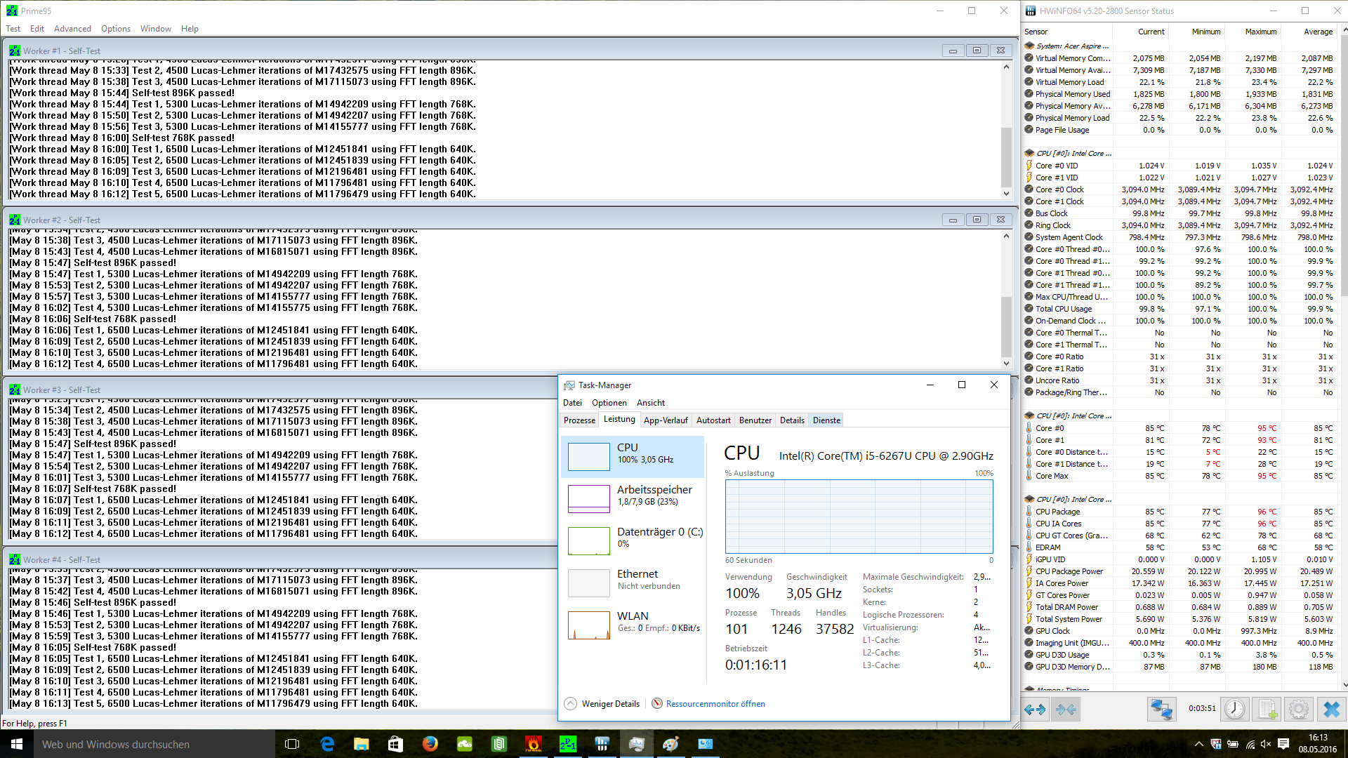 Damit der potentielle Turbo-Boost-Spielraum auch wirklich immer und überall ausgereizt wird, hat Acer die ohnehin sehr hohe TDP des Core i5-6267U nochmals von 28 auf 35 Watt angehoben. Damit bearbeitet das Aspire im Netz- und Akkubetrieb Single-Thread-Benchmarks mit stabilen 3,3 GHz (~11 Watt CPU-Verbrauch), bei Multi-Threading liegen ebenfalls die maximalen 3,1 GHz (~17 Watt CPU-Verbrauch) an. Der Vorsprung auf den beliebten Core i5-6200U (15 Watt TDP) bewegt sich je nach Test zwischen 20 und 25 Prozent. Unterm Strich kann sich der i5-6267U in etwa mit dem teureren Core i7-6600U (15 Watt TDP) messen, dessen Leistung bei anhaltender Volllast jedoch früher oder später abfällt – sofern der Hersteller nicht wie Lenovo im Falle des ThinkPad T460s das 15-Watt-Limit angehoben hat.