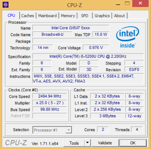 Acer setzt bei der Aspire V3-574G Reihe auf ULV-Prozessoren (TDP: 15 Watt) der Broadwell Generation. Unser aktuelles Testgerät ist mit einer Mittelklasse-CPU bestückt - dem Core i5-5200U Zweikernprozessor. Der Prozessor arbeitet mit einer Basisgeschwindigkeit von 2,2 GHz. Mittels Turbo kann die Geschwindigkeit auf 2,5 GHz (beide Kerne) bzw. 2,7 GHz (nur ein Kern) erhöht werden. Die volle Leistung des Prozessors steht sowohl im Netz- als auch im Akkubetrieb zur Verfügung. Die von uns durchgeführten Tests werden stets mit voller Geschwindigkeit bearbeitet. Da in dem von uns getesteten Vorgängermodell des Aspire der Vorgänger (Core i5-4200U) des hier verbauten Prozessors steckt, bietet sich ein Vergleich an. So erreicht der Core i5-5200U Prozessor im Durchschnitt um gut 10 Prozent bessere Resultate als sein Vorgänger. Dies ist seinen minimal höheren Arbeitsgeschwindigkeiten und den Verbesserungen der Broadwell Architektur zu verdanken.