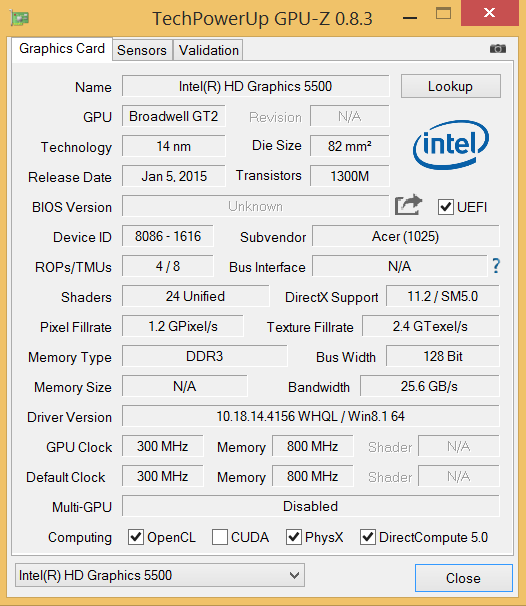 Neben der GeForce GPU steckt auch Intels HD Graphics 5500 Grafikkern in dem Rechner. Die beiden GPUs bilden einen Umschaltgrafiklösung (Optimus). Nvidias Kern ist für leistungsfordernde Anwendungen wie Computerspiele zuständig. Im Alltags- und Akkubetrieb hat Intels GPU ihren Auftritt. Die Umschaltung zwischen den Kernen erfolgt automatisch; der Nutzer muss sich um nichts kümmern.