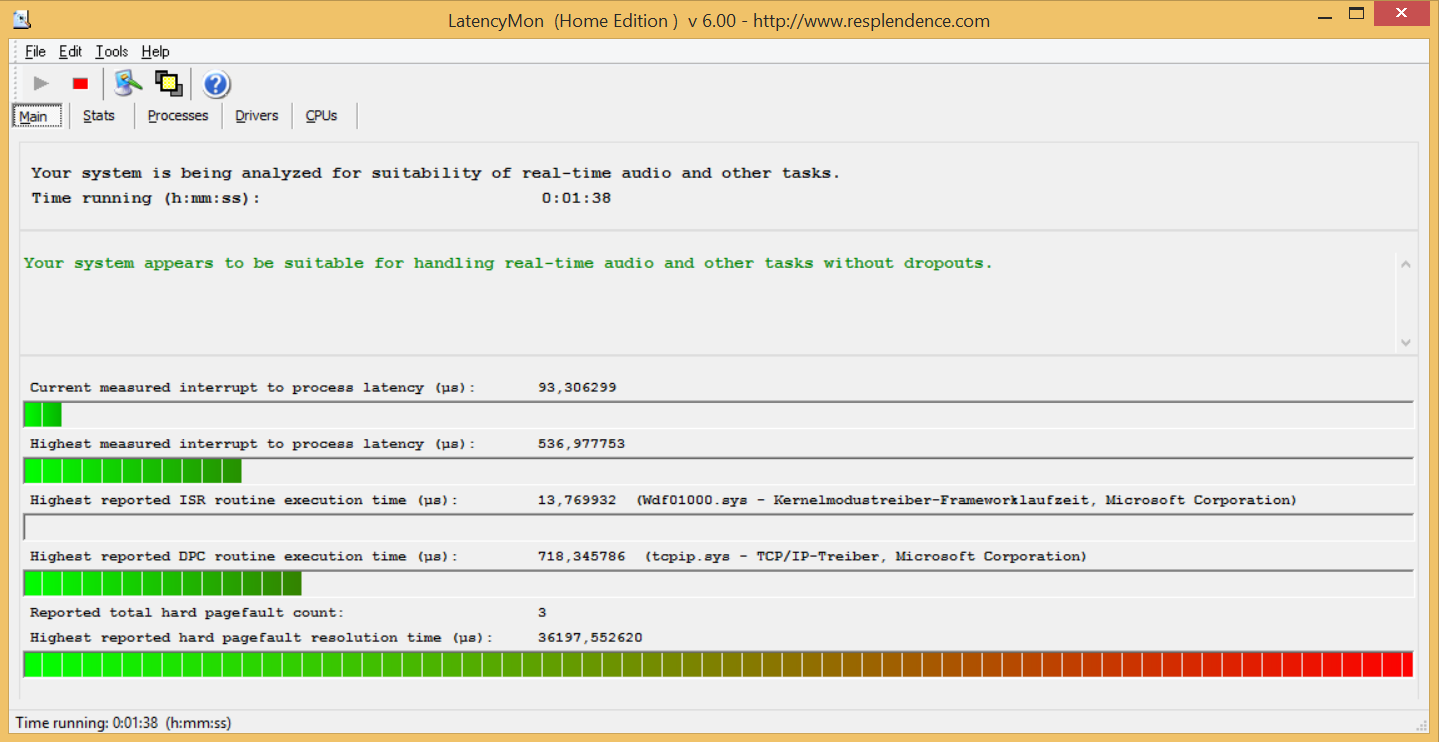 Den Stresstest (Prime95 und Furmark laufen für mindestens eine Stunde) durchläuft das Aspire im Netz- und im Akkubetrieb auf ähnliche Weisen. Im Netzbetrieb arbeitet der Grafikkern mit konstanten 1.163 MHz. Im Akkubetrieb erreicht er diese Geschwindigkeit auch, wird aber immer wieder schlagartig auf 291 MHz abgebremst. Die Geschwindigkeit des Prozessors springt zwischen 500 MHz und 2,5 GHz (Netzbetrieb) bzw. 2,2 bis 2,4 GHz (Akkubetrieb) hin und her. Obwohl der Prozessor immer wieder abgebremst wird, erwärmt sich der Rechner während des Stresstests an einigen Stellen sehr stark. An einem Messpunkt wird die Sechzig-Grad-Celsius-Marke überschritten. Im Normalbetrieb erwärmt sich der Rechner bei weitem nicht so stark. Unser Stresstest stellt ein Extremszenario dar, das so im Alltag in der Regel nicht auftritt.