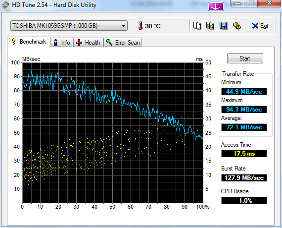 Auch wenn andere SSDs dem eingesetzten Intel Laufwerk hier problemlos davonziehen können, fällt der Vergleich mit der im Aspire V3-771G ebenso verbauten Toshiba MK1059GSMP-Harddisk eindrucksvoll aus: Zugriffszeit 17.5 Millisekunden vs. 0.18/0.12 beim Intel SSD.