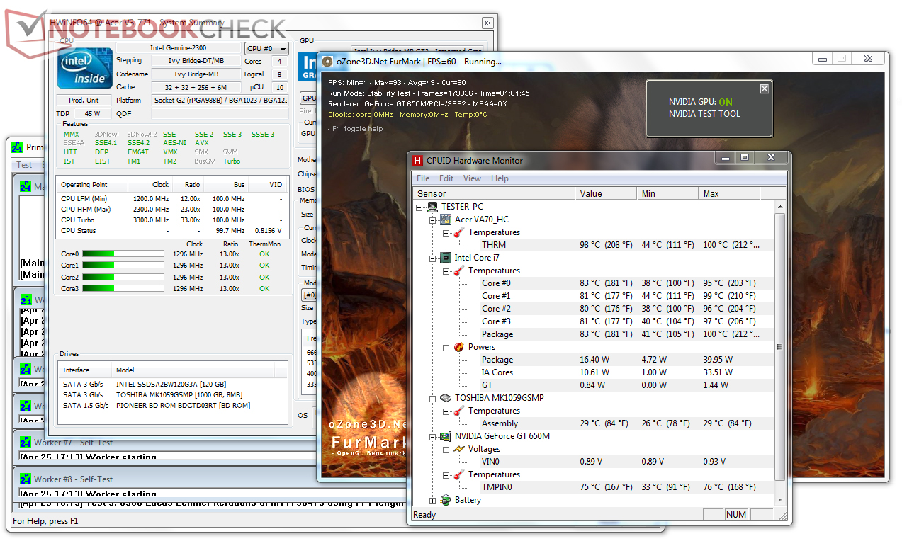 Flankiert wird die GPU von einem Prozessor der ebenso eben erst gelaunchten Intel -Ivy-Bridge-Generation, der i7-3610QM, quasi dem Einstiegschip in die Welt aktueller mobiler Quadcore CPUs. Da das 17-Zoll-Gehäuse über ausreichende Platzverhältnisse im Inneren verfügt, sieht Acer gleich zwei 2.5-Zoll-Laufwerksschächte vor, die in unserer High-End-Testkonfiguration mit einer 120-GB-SSD als Systemdatenträger und einer 1-TB-Daten-HDD bestückt sind.