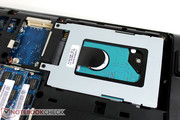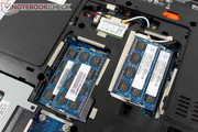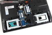 Über eine vergleichsweise große Klappe an der Geräteunterseite erhält der User Zugang zu den beiden Laufwerksschächten, allen vier RAM-Speicherbänken, dem WLAN-Modul als auch einem feien mSATA-Slot. Nicht zugänglich sind hingegen CPU und GPU als auch das gesamte Kühlsystem. Bei weiterem Öffnen des Gerätes riskiert man den Garantieverlust des Gerätes.