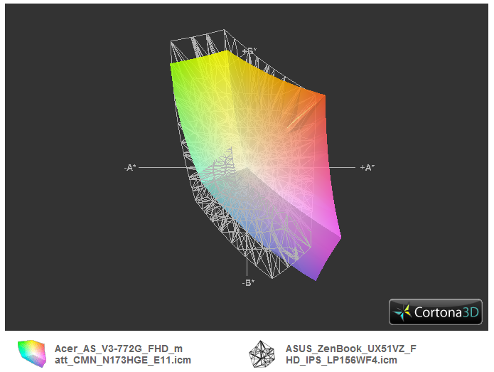 Die Farbtreue leidet wie die Graustufen ebenso unter der Tendenz zu Blau. Besonders deutlich ist dies bei Cyan (DeltaE 13) und Magenta, Gelb sowie Rot (DeltaE ~ 8). Auch hier kann die Kalibrierung dies abstellen, lediglich Gelb verbleibt mit einem DeltaE von moderat 4. Das Panel hat also Potenzial. Welcher Nutzer hat aber Zugriff auf ein Fotospektrometer bzw. weiß, dass TFTs kalibriert werden können? Die Antwort lautet: die wenigsten, weshalb die Display-Wertung einen Dämpfer erhält. Das IPS-Panel des kleinen Bruders V3-571G (je nach Modell/Preis) war in Sachen Farben besser (auch vor Kalibrierung).