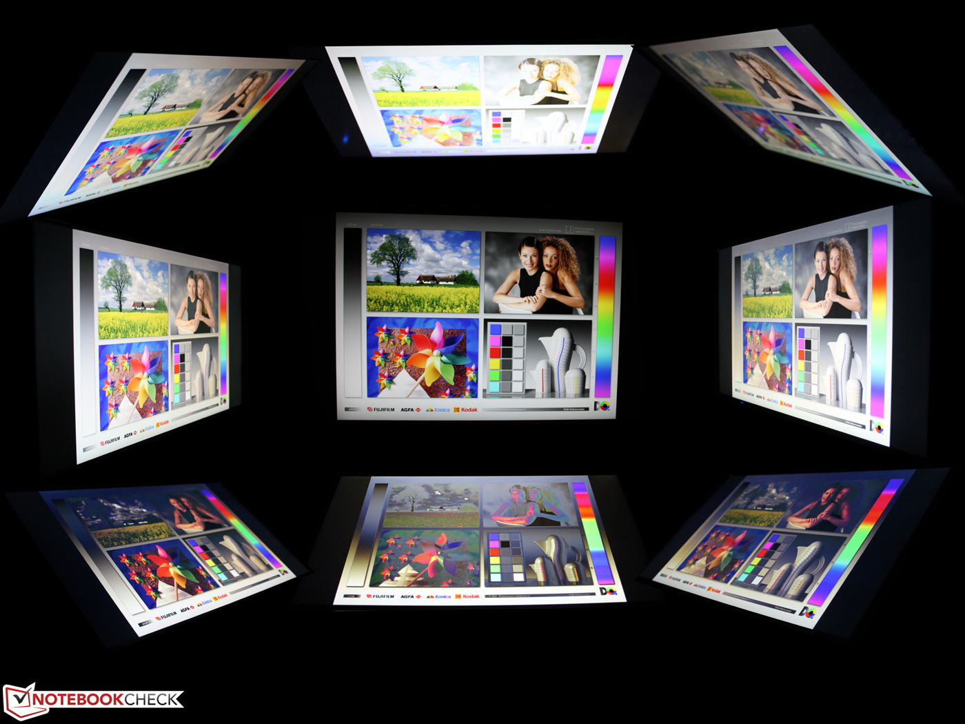 Das Bild wird erst bei sehr schräger Sichtposition unkenntlich, weil es dann zu stark abdunkelt. Die Fotos entstanden bei Bewölkung am kalibrierten Display und bei automatisch reduzierter Helligkeit. Wie oben beschrieben könnten die Blickwinkel unkalibriert etwas besser ausfallen.