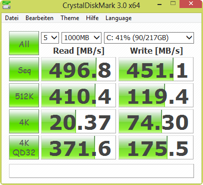 Die Datenraten in der Rubrik Sequential Read schreiben beeindruckende Werte, unterscheiden sich aber nicht. Bewegung kommt in den Vergleich, wenn etwa der 4K-Test (Lesen kleiner, verstreuter Blöcke) einzeln betrachtet wird. Die Samsung SSDs 840 Series (MZ-7TD500) und PM841 (MZMTD256HAGM) sind knapp 60 % schneller. Selbst im Gesamtvergleich zu allen bisher getesteten SSDs ist ein 4K-Read von 32 MB/s die Spitze der Messlatte.