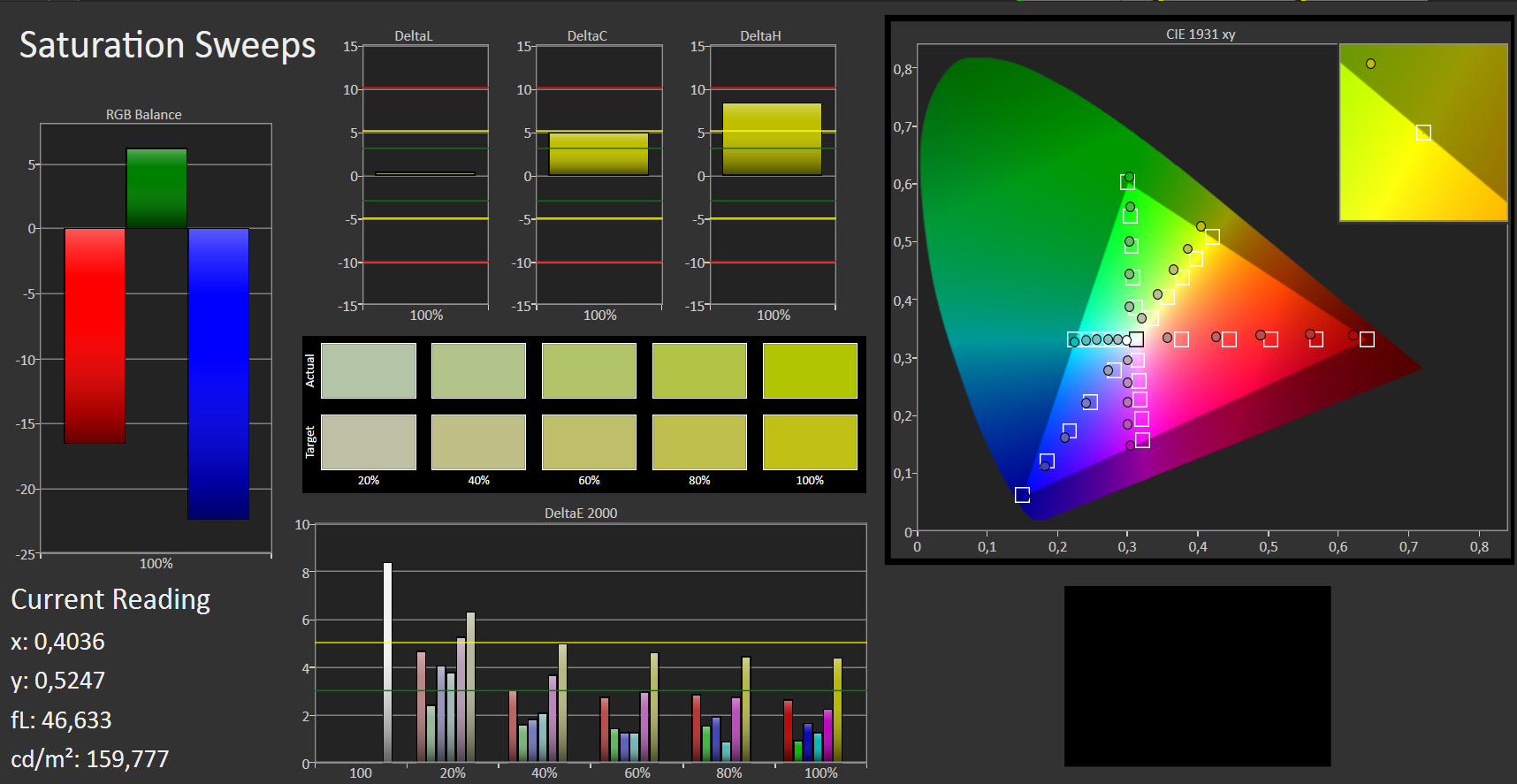 Eine weitere (gemeinsame) Schwäche ist mit dem bloßen Auge als auch mit dem Fotospektrometer erkennbar: Es handelt sich um den deutlichen Blaustich (siehe Screen Grayscale). Folgende zwei Screen-Reihen zeigen die Farbanalyse des i1 Pro 2 Fotospektrometers und der CalMAN 5 Software. Vermessen im werkseitigen Zustand liegt das DeltaE(2000) der Graustufen bei 11. Dies verändert sich durch die Kalibrierung nicht wesentlich. Der DeltaE(2000) von 5 ist zwar erträglicher, blau ist aber immer noch auszumachen.