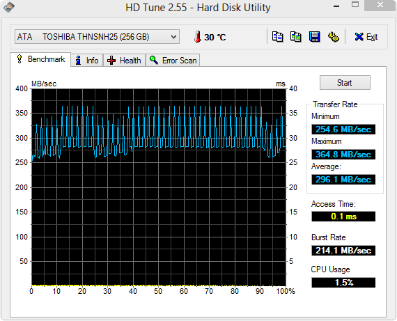 Zwei Toshiba Massenspeicher sorgen für Platz und Geschwindigkeit. Die MQ Series 1.000 GB (MQ01ABD100) mit 5.400 U/Min ist eine 9,5 mm hohe 2,5-Zoll-SATA-SSD. Sie ist als Laufwerk D: eingerichtet. Zur Seite steht eine 256-GB-SSD (mSATA 6 GB/s) mit der Bezeichnung THNSNH256GMCT. Dieses mSATA-Modul kostet im Einzelverkauf übrigens 190 Euro.