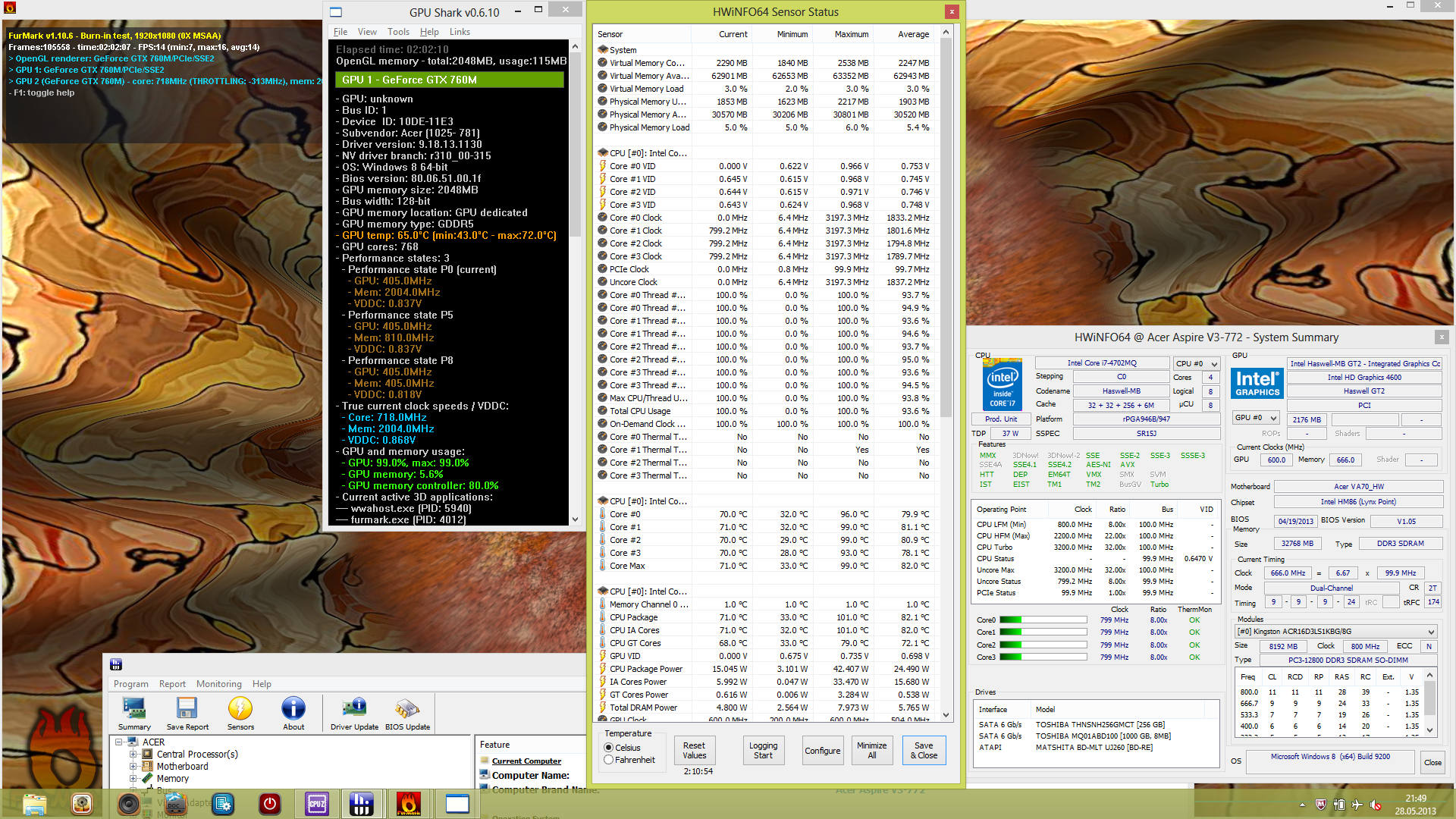 Wie verhalten sich die Turbo-Frequenzen? Getreu dem Datenblatt steht der Takt bei Multi-Core-Last (R11.5 Multi Benchmark oder Prime95-CPU-Stresstest) konstant auf 2,9 GHz. Der Prozessor ist dabei nur 70-73 Grad warm. Auf Seiten der GTX 760M liegt der Kerntakt unter Last stabil bei 718 MHz (Speicher 1.002 MHz). Der Grafik-Turbo kann zwischen 628 und 718 MHz agieren.