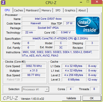 Intels Core i7 4702MQ (2x 2,2 GHz) ist ein Quadcore-Prozessor der Haswell Generation, welche dieser Tage gelauncht wurde (Q2/2013). Die Fertigung ist weiterhin in 22 Nanometer, und ein Turbo-Feature ist auch wieder dabei (1 Kern bis 3,2 GHz). Die Besonderheit dieser CPU ist der TDP von 37 Watt (statt 47 Watt). Alle technischen Details finden sie im 4702MQ-Datenblatt.