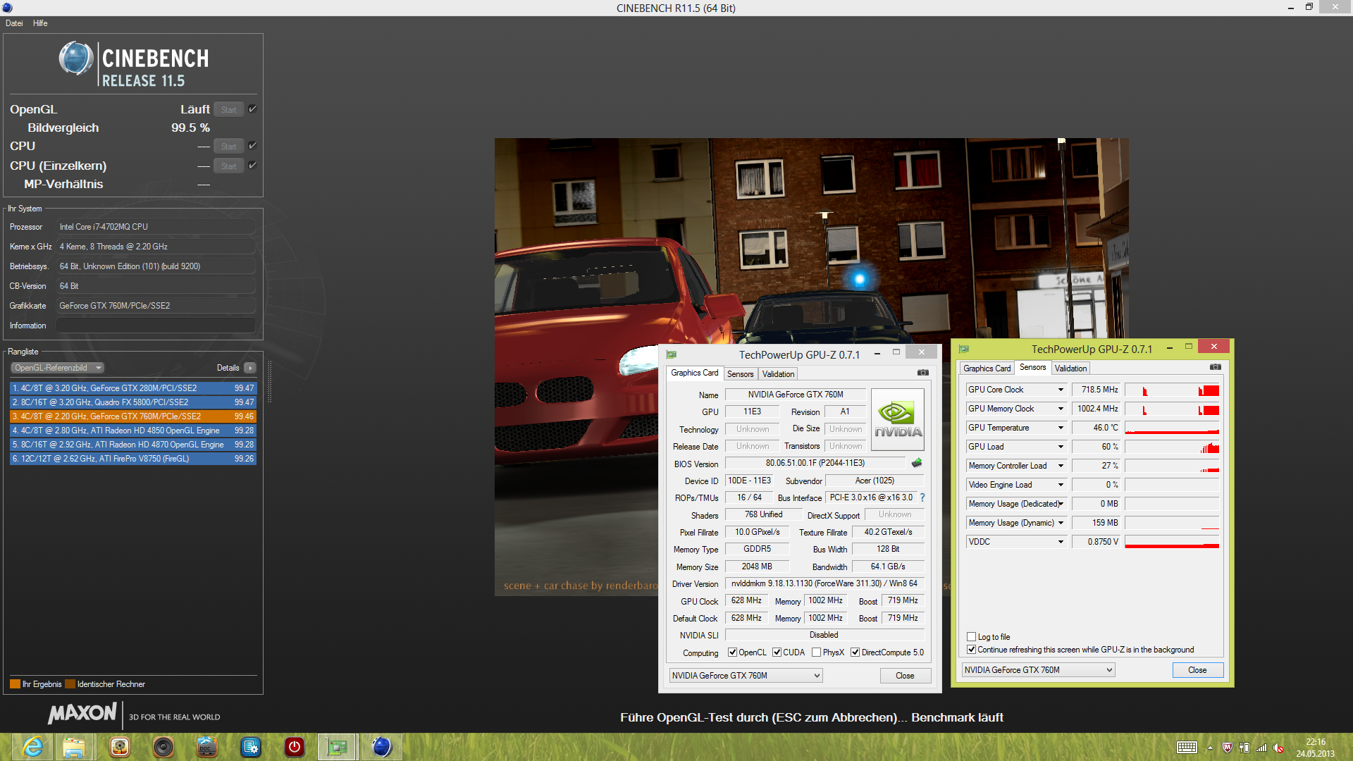 Die HD 4600 wollen wir in dieser Hinsicht nicht vergessen, sie legt 1.150 MHz hin (Idle 400 MHz). Die Cinebench R11.5 Tests haben wir ebenfalls im Akkubetrieb ausgeführt, wobei die GTX 760M erzwungen wurde (Nvidia Settings). Alle drei Scores waren ident mit dem Netzbetrieb.