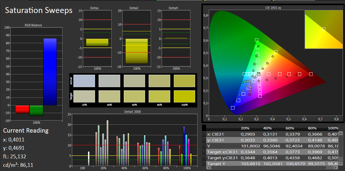 Die durchschnittliche DeltaE-2000-Abweichung des Bildschirms fällt mit einem Wert von 10,68 moderat aus. Dieser Wert wird von einigen dunklen Tönen und den Graustufen überschritten. Den Zielbereich (DeltaE kleiner 5) erreicht keine Farbe. Der Bildschirm leidet an einem deutlichen Blaustich.