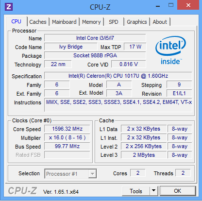 Das Aspire ist mit einem Celeron 1017U-Prozessor bestückt, der mit einer Geschwindigkeit von 1,6 GHz arbeitet. Einen Turbo gibt es nicht. Dieser Zweikern-Prozessor basiert auf Intels Ivy-Bridge-Architektur.