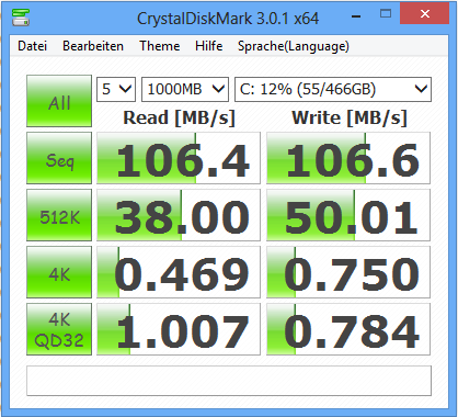 Acer bestückt das Aspire mit einer Festplatte aus der Momentus Thin-Serie von Seagate. Die Platte besitzt eine Kapazität von 500 GB und arbeitet mit 5.400 Umdrehungen pro Minute. CrystalDiskMark meldet eine Lesegeschwindigkeit von 106,4 MB/s. HD Tune liefert eine durchschnittliche Transferrate von 82,8 MB/s. Diese Werte sind heutzutage bei 5.400er-Festplatten üblich.
